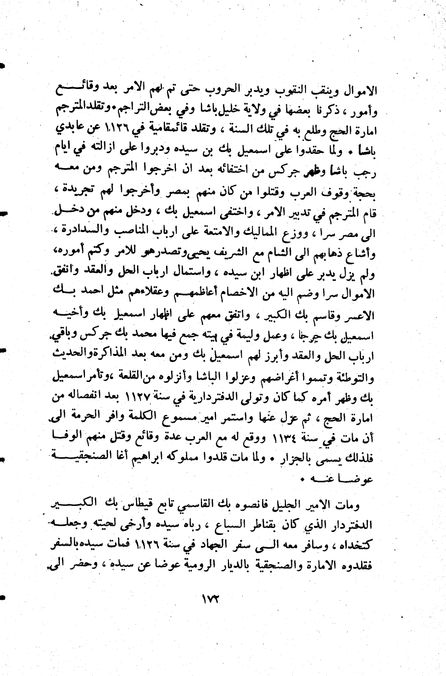 الأموال وينقب النقوب ويدبر الحروب حتى تم لهم الأمر بعد وقائع وأمور ذكرنا بعضها في ولاية خليل باشا وفي بعض التراجم. وتقلد المترجم إمارة الحج وطلع به في تلك السنة وتقلد قائمقامية في 1126 عن عابدي باشا. ولما حقدوا على إسمعيل بك بن سيده ودبروا على ازالته في أيام رجب باشا وظهر جركس من اختفائه بعد أن اخرجوا المترجم ومن معه بحجة وقوف العرب وقتلوا من كان منهم بمصر وأخرجوا لهم تجريدة قام المترجم في تدبير الأمر واختفى إسمعيل بك ودخل منهم من دخل إلى مصر سرا ووزع المماليك والأمتعة على أرباب المناصب والسدادرة وأشاع ذهابهم إلى الشام مع الشريف يحيى وتصدر هو للامر وكتم أموره ولم يزل يدبر على اظهار ابن سيده واستمال أرباب الحل والعقد وانفق الأموال سرا وضم إليه من الاخصام أعاظمهم وعقلاءهم مثل أحمد بك الأعسر وقاسم بك الكبير واتفق معهم على اظهار إسمعيل بك واخيه إسمعيل بك جرجا وعمل وليمة في بيته جمع فيها محمد بك جركس وباقي أرباب الحل والعقد وأبرز لهم إسمعيل بك ومن معه بعد المذاكرة والحديث والتوطئة وتمموا أغراضهم وعزلوا الباشا وأنزلوه من القلعة وتأمر إسمعيل بك وظهر أمره كما كان وتولى الدفتردارية في سنة 1127 بعد انفصاله من إمارة الحج ثم عزل عنها واستمر أمير مسموع الكلمة وافر الحرمة إلى أن مات في سنة 1134 ووقع له مع العرب عدة وقائع وقتل منهم الوفا فلذلك يسمى بالجزار. ولما مات قلدوا مملوكه إبراهيم أغا الصنجقية عوضا عنه.