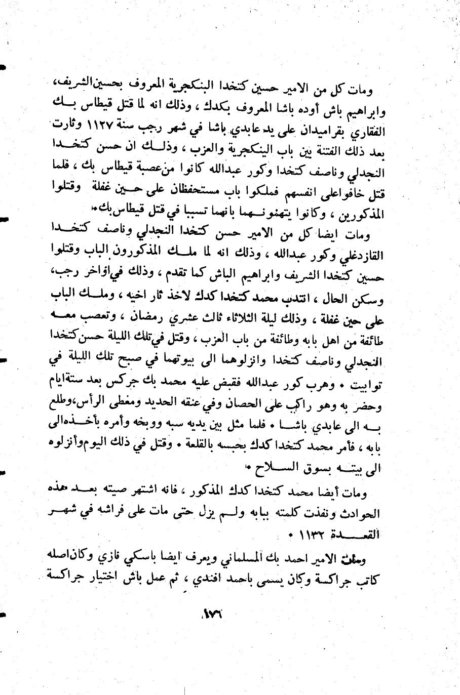ومات كل من الأمير حسين كتخدا الينكجرية المعروف بحسين الشريف وإبراهيم باش أوده باشا المعروف بكدك وذلك أنه لما قتل قيطاس بك الفقاري بقراميدان على يد عابدي باشا في شهر رجب سنة 1127 وثارت بعد ذلك الفتنة بين باب الينكجرية والعزب وذلك أن حسن كتخدا النجدلي وناصف كتخدا وكور عبد الله كانوا من عصبة قيطاس بك فلما قتل خافوا على انفسهم فملكوا باب مستحفظان على حين غفلة وقتلوا المذكورين وكانوا يتهمونهما بانهما تسببا في قتل قيطاس بك.