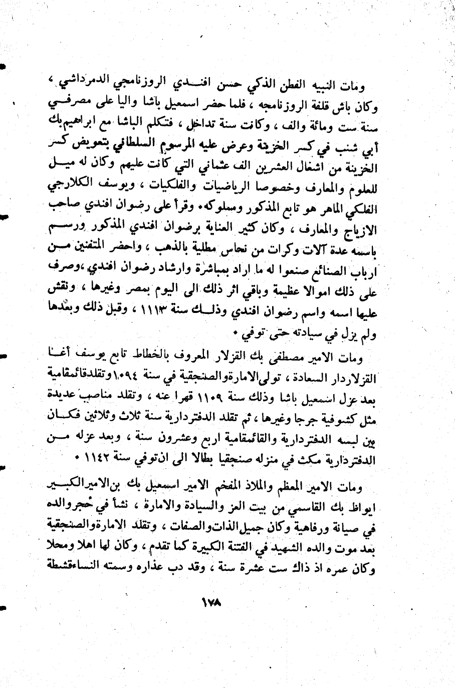 ومات النبيه الفطن الذكي حسن افندي الروزنامجي الدمرداشي وكان باش قلفه الروزنامجه فلما حضر إسمعيل باشا واليا على مصر في سنة ست ومائة وألف وكانت سنة تداخل فتكلم الباشا مع إبراهيم بك أبي شنب في كسر الخزينة وعرض عليه المرسوم السلطاني بتعويض كسر الخزينة من اشغال العشرين ألف عثماني التي كانت عليهم وكان له ميل للعلوم والمعارف وخصوصا الرياضيات والفلكليات ويوسف الكلارجي الفلكي الماهر هو تابع المذكور ومملوكه. وقرأ على رضوان افندي صاحب الازياج والمعارف وكان كثير العناية برضوان افندي المذكور ورسم باسمه عدة آلات وكرات من نحاس مطلية بالذهب واحضر المتفنين من أرباب الصنائع صنعوا له ما أراد بمباشرة وارشاد رضوان افندي وصرف على ذلك أموالا عظيمة وباقي اثر ذلك إلى اليوم بمصر وغيرها ونقش عليها اسمه واسم رضوان افندي وذلك سنة 1113 وقبل ذلك وبعدها ولم يزل في سيادته حتى توفي.