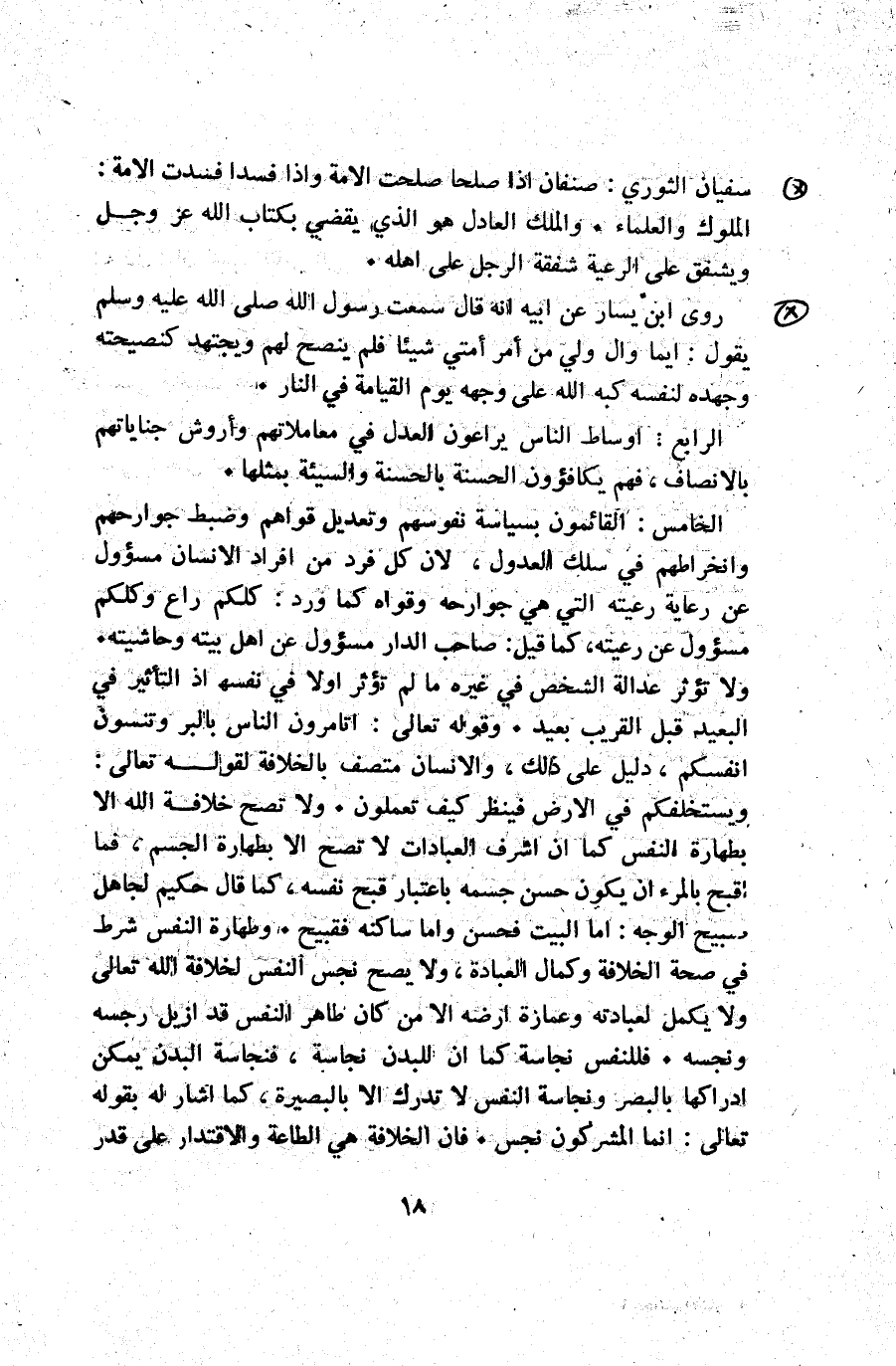 سفيان الثوري: "صنفان إذا صلحا صلحت الأمة وإذا فسدا فسدت الأمة الملوك والعلماء" والملك العادل هو الذي يقضي بكتاب الله عز وجل ويشفق على الرعية شفقة الرجل على أهله.