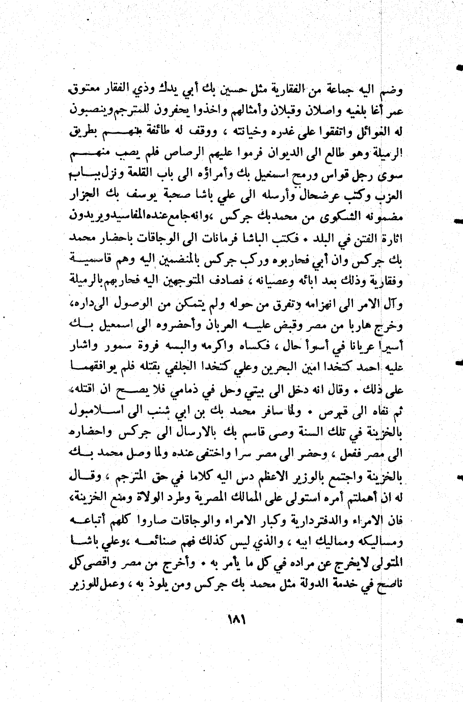 وضم إليه جماعة من الفقارية مثل حسين بك أبي يدك وذي الفقار معتوق عمر أغا بلغيه وأصلان وقبلان وأمثالهم وأخذوا يحفرون للمترجم وينصبون له الغوائل واتفقوا على غدره وخيانته ووقف له طائفة منهم بطريق الرميلة وهو طالع إلى الديوان فرموا عليهم الرصاص فلم يصب منهم سوى رجل قواس ورمح إسمعيل بك وأمراؤه إلى باب القلعة ونزل بباب العزب وكتب عرضحال وأرسله إلى علي باشا صحبة يوسف بك الجزار مضمونه الشكوى من محمد بك جركس وانه جامع عنده المفاسيد ويريدون اثارة الفتن في البلد. فكتب الباشا فرمانات إلى الوجاقات باحضار محمد بك جركس وإن أبي فحاربوه وركب جركس بالمنضمين إليه وهم قاسمية وفقارية وذلك بعد ابائه وعصيانه فصادف المتوجهين إليه فحاربهم بالرميلة وآل الأمر إلى انهزامه وتفرق من حوله ولم يتكمن من الوصول إلى داره وخرج هاربا من مصر وقبض عليه العربان وأحضروه إلى إسمعيل بك أسيرا عريانا في أسوأ حال فكساه وأكرمه والبسه فروة سمور واشار عليه أحمد كتخدا امين البحرين وعلي كتخدا الجلفي بقتله فلم يوافقهما على ذلك. وقال: إنه دخل إلى بيتي وحل في ذمامي فلا يصح أن أقتله ثم نفاه إلى قبرص. ولما سافر محمد بك بن أبي شنب إلى اسلامبول بالخزينة في تلك السنة وصى قاسم بك بالارسال إلى جركس واحضاره إلى مصر ففعل وحضر إلى مصر سرا واختفى عنده ولما وصل محمد بك بالخزينة واجتمع بالوزير الاعظم دس إليه كلاما في حق المترجم وقال له: إن أهملتم أمره استولى على الممالك المصرية وطرد الولاة ومنع الخزينة فإن الأمراء والدفتردارية وكبار الأمراء والوجاقات صاروا كلهم أتباعه ومساليكه ومماليك أبيه والذي ليس كذلك فهم صنائعه وعلي باشا المتولى لا يخرج عن مراده في كل ما يأمر به. وأخرج من مصر وأقصى كل ناصح في خدمة الدولة مثل محمد بك جركس ومن يلوذ به وعمل للوزير