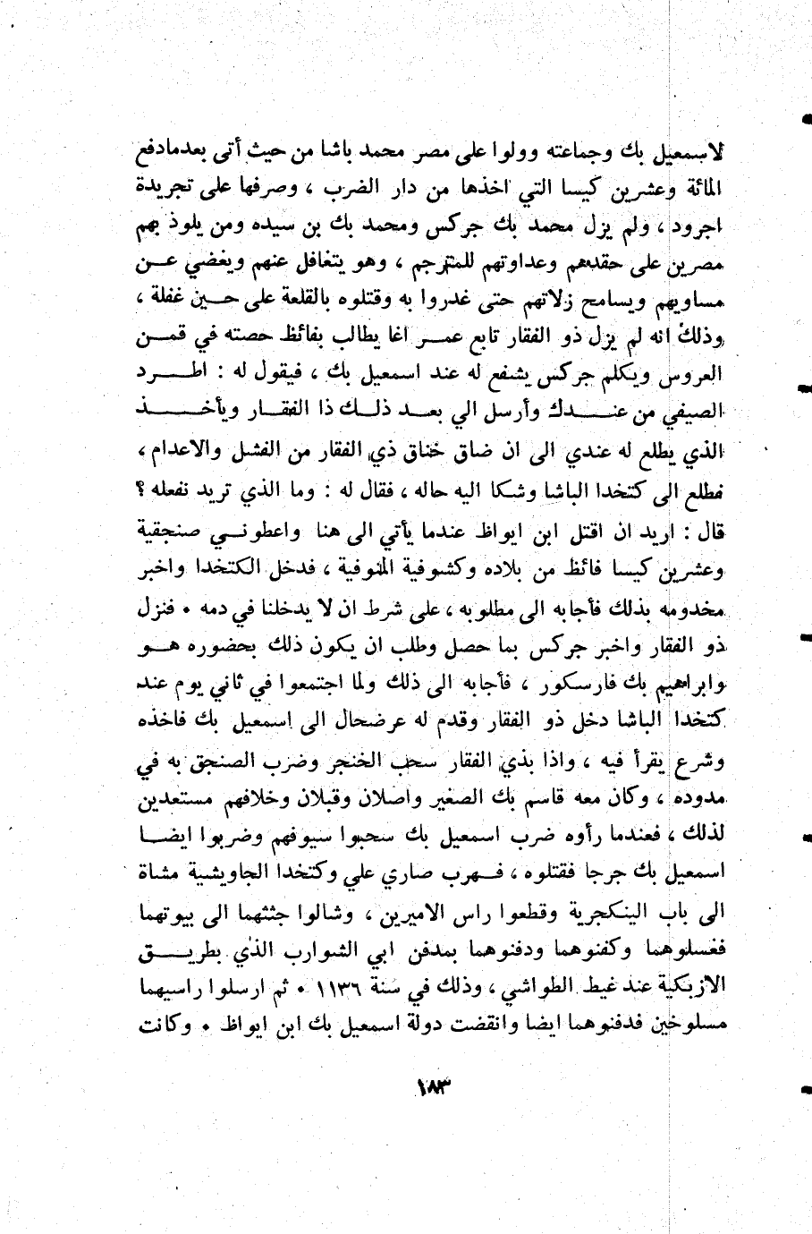 لاسمعيل بك وجماعته وولوا على مصر محمد باشا من حيث أتى بعدما دفع المائة وعشرين كيسا التي اخذها من دار الضرب وصرفها على تجريدة اجرود ولم يزل محمد بك جركس ومحمد بك بن سيده ومن يلوذ بهم مصرين على حقدهم وعداوتهم للمترجم وهو يتغافل عنهم ويغضي عن مساويهم ويسامح زلاتهم حتى غدروا به وقتلوه بالقلعة على حين غفلة وذلك أنه لم يزل ذو الفقار تابع عمر اغا يطالب بفائظ حصته في قمن العروس ويكلم جركس يشفع له عند إسمعيل بك فيقول له: اطرد الصيفي من عندك وأرسل الي بعد ذلك ذا الفقار ويأخذ الذي يطلع له عندي إلى أن ضاق خناق ذي الفقار من الفشل والاعدام فطلع إلى كتخدا الباشا وشكا إليه حاله فقال له: وما الذي تريد نفعله قال: اريد أن أقتل ابن ايواظ عندما يأتي إلى هنا واعطوني صنجقية وعشرين كيسا فائظ من بلاده وكشوفية المنوفية فدخل الكتخدا واخبر مخدومه بذلك فأجابه إلى مطلوبه على شرط أن لا يدخلنا في دمه. فنزل ذو الفقار واخبر جركس بما حصل وطلب أن يكون ذلك بحضوره هو وإبراهيم بك فارسكور فأجابه إلى ذلك ولما اجتمعوا في ثاني يوم عند كتخدا الباشا دخل ذو الفقار وقدم له عرضحال إلى إسمعيل بك فأخذه وشرع يقرأ فيه وإذا بذي الفقار سحب الخنجر وضرب الصنجق به في مدوده وكان معه قاسم بك الصغير واصلان وقبلان وخلافهم مستعدين لذلك فعندما رأوه ضرب إسمعيل بك سحبوا سيوفهم وضربوا أيضا إسمعيل بك جرجا فقتلوه فهرب صاري علي وكتخدا الجاويشية مشاة إلى باب الينكجرية وقطعوا راس الأميرين وشالوا جثثهما إلى بيوتهما فغسلوهما وكفنوهما ودفنوهما بمدفن أبي الشوارب الذي بطريق الازبكية عند غيظ الطواشي وذلك في سنة 1136. ثم أرسلوا رأسيهما مسلوخين فدفنوهما أيضا وانقضت دولة إسمعيل بك ابن ايواظ. وكانت