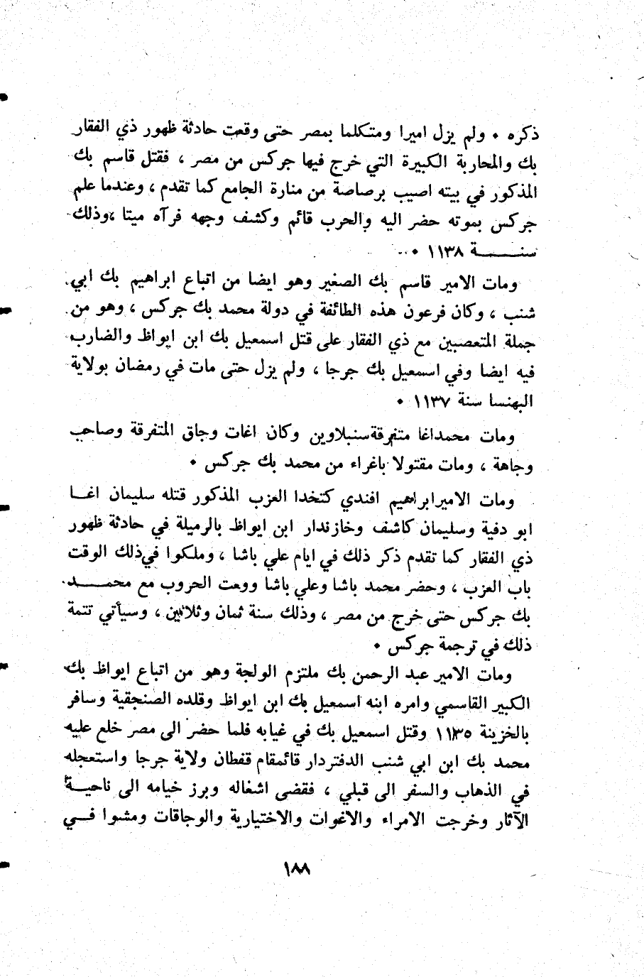 ومات الأمير قاسم بك الصغير وهو أيضا من اتباع إبراهيم بك أبي شنب وكان فرعون هذه الطائفة في دولة محمد بك جركس وهو من جملة المتعصبين مع ذي الفقار على قتل إسمعيل بك ابن ايواظ والضارب فيه أيضا وفي إسمعيل بك جرجا ولم يزل حتى مات في رمضان بولاية البهنسا سنة 1137.