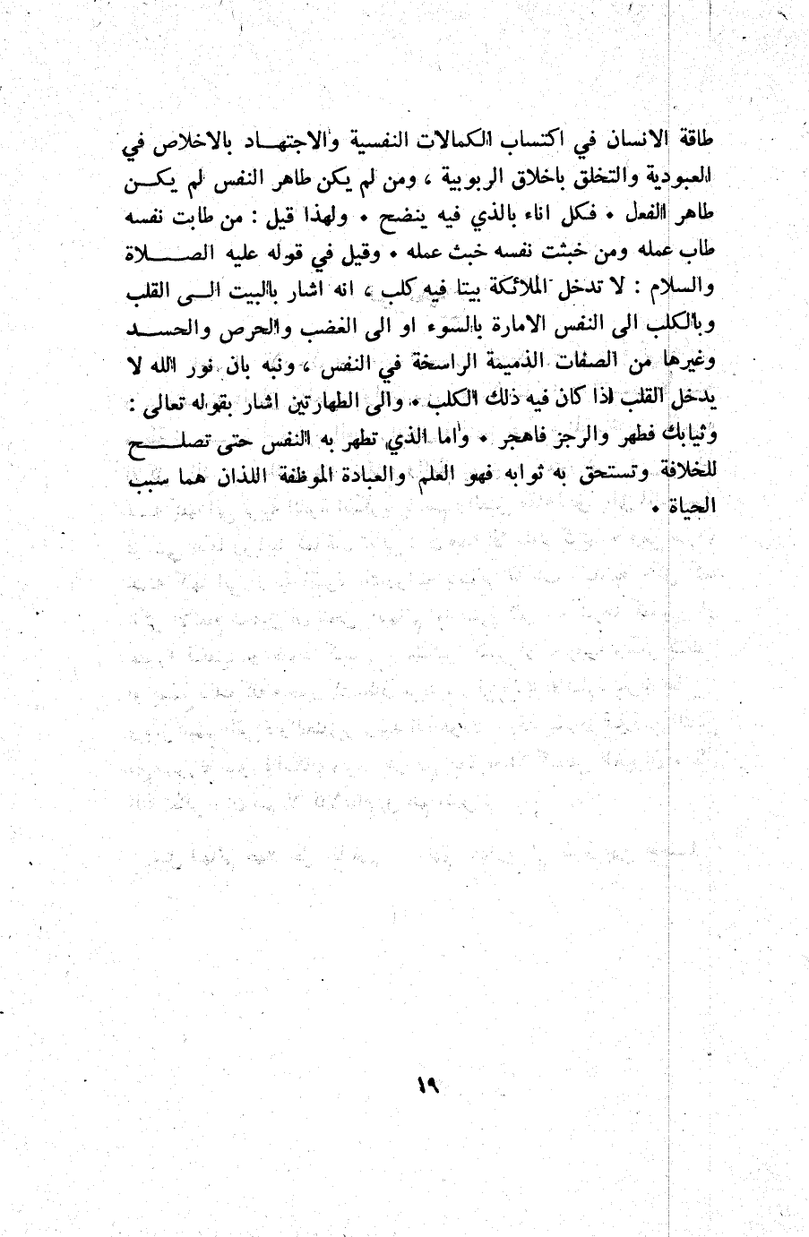 طاقة الإنسان في أكتساب الكمالات النفسية والاجتهاد بالاخلاص في العبودية والتخلق باخلاق الربوبية ومن لم يكن طاهر النفس لم يكن طاهر الفعل. فكل إناء بالذي فيه ينضح. ولهذا قيل: من طابت نفسه طاب عمله ومن خبثت نفسه خبث عمله وقيل: في قوله عليه الصلاة والسلام: "لا تدخل الملائكة بيتا فيه كلب" أنه أشار بالبيت إلى القلب وبالكلب إلى النفس الأمارة بالسوء أو إلى الغضب والحرص والحسد وغيرها من الصفات الذميمة الراسخة في النفس ونبه بان نور الله لا يدخل القلب إذا كان فيه ذلك الكلب. وإلى الطهارتين اشار بقوله تعالى: {وَثِيَابَكَ فَطَهِّرْ*وَالرُّجْزَ فَاهْجُرْ} . وأما الذي تطهر به النفس حتى تصلح للخلافة وتستحق به ثوابه فهو العلم والعبادة الموظفة اللذان هما سبب الحياة.