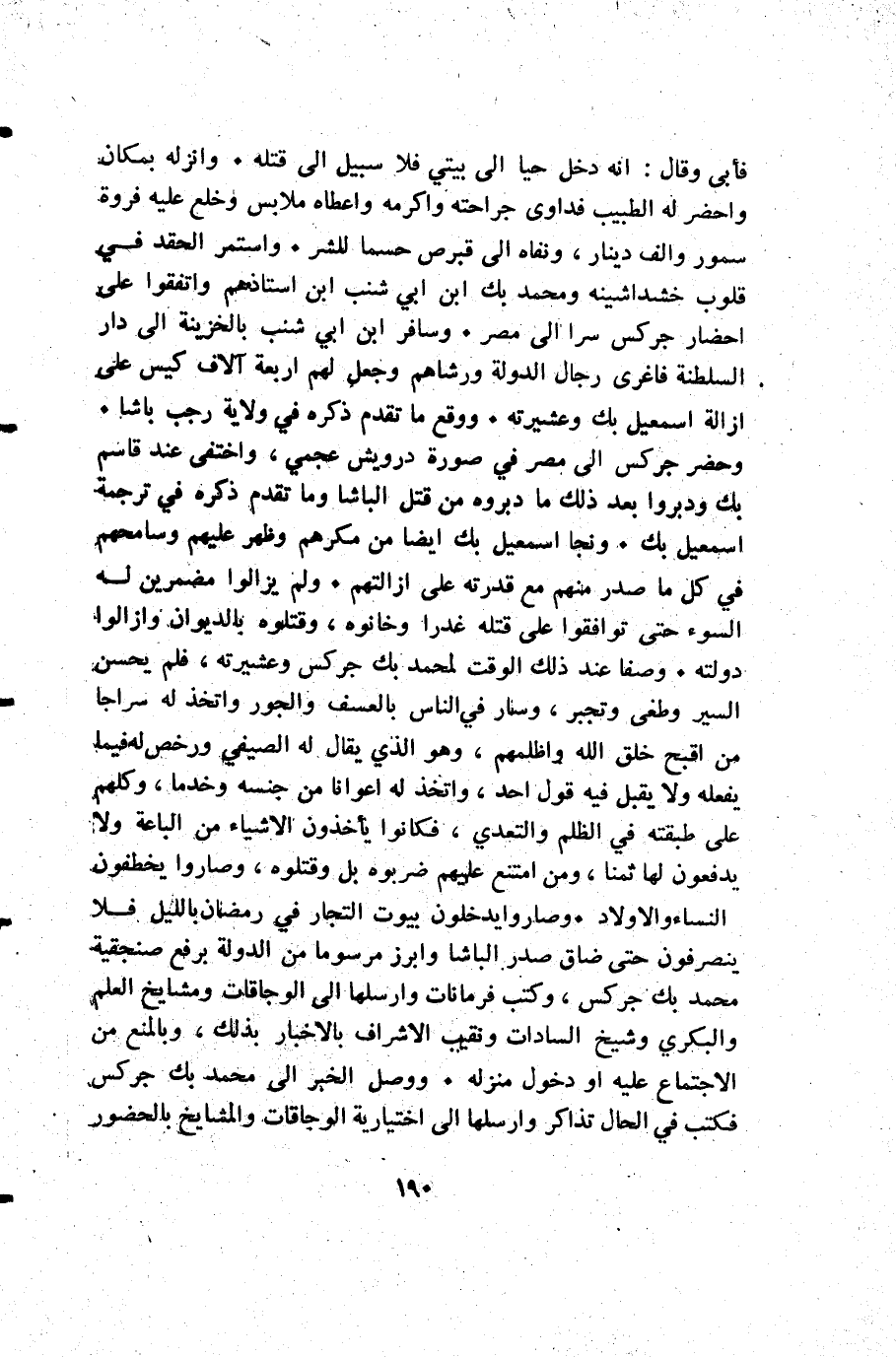 فأبى وقال: إنه دخل حيا إلى بيتي فلا سبيل إلى قتله. وانزله بمكان واحضر له الطبيب فداوى جراحته وأكرمه واعطاه ملابس وخلع عليه فروة سمور وألف دينار ونفاه إلى قبرص حسما للشر. واستمر الحقد في قلوب خشداشينه ومحمد بك ابن أبي شنب ابن أستاذهم واتفقوا على أحضار جركس سرا إلى مصر. وسافر ابن أبي شنب بالخزينة إلى دار السلطنة فاغرى رجال الدولة ورشاهم وجعل لهم أربعة آلاف كيس على ازالة إسمعيل بك وعشيرته. ووقع ما تقدم ذكره في ولاية رجب باشا. وحضر جركس إلى مصر في صورة درويش عجمي واختفى عند قاسم بك ودبروا بعد ذلك ما دبروه من قتل الباشا وما تقدم ذكره في ترجمة إسمعيل بك. ونجا إسمعيل بك أيضا من مكرهم وظهر عليهم وسامحهم في كل ما صدر منهم مع قدرته على ازالتهم. ولم يزالوا مضمرين له السوء حتى توافقوا على قتله غدرا وخانوه وقتلوه بالديوان وازالوا دولته. وصفا. وصفا عند ذلك الوقت لمحمد بك جركس وعشيرته فلم يحسن السير وطغى وتجبر وسار في الناس بالعسف والجور واتخذ له سراجا من أقبح خلق الله واظلمهم وهو الذي يقال له الصيفي ورخص له فيما يفعله ولا يقبل فيه قول أحد واتخذ له اعوانا من جنسه وخدما وكلهم على طبقته في الظلم والتعدي فكانوا يأخذون الأشياء من الباعة ولا يدفعون لها ثمنا ومن امتنع عليهم ضربوه بل وقتلوه وصاروا يخطفون النساء والأولاد. وصاروا يدخلون بيوت التجار في رمضان بالليل فلا ينصرفون حتى ضاق صدر الباشا وابرز مرسوما من الدولة برفع صنجقية محمد بك جركس وكتب فرامانات وأرسلها إلى الوجاقات ومشايخ العلم والبكري وشيخ السادات ونقيب الأشراف بالاخبار بذلك وبالمنع من الاجتماع عليه أو دخول منزله. ووصل الخبر إلى محمد بك جركس فكتب في الحال تذاكر وأرسلها إلى اختيارية الوجاقات والمشايخ بالحضور