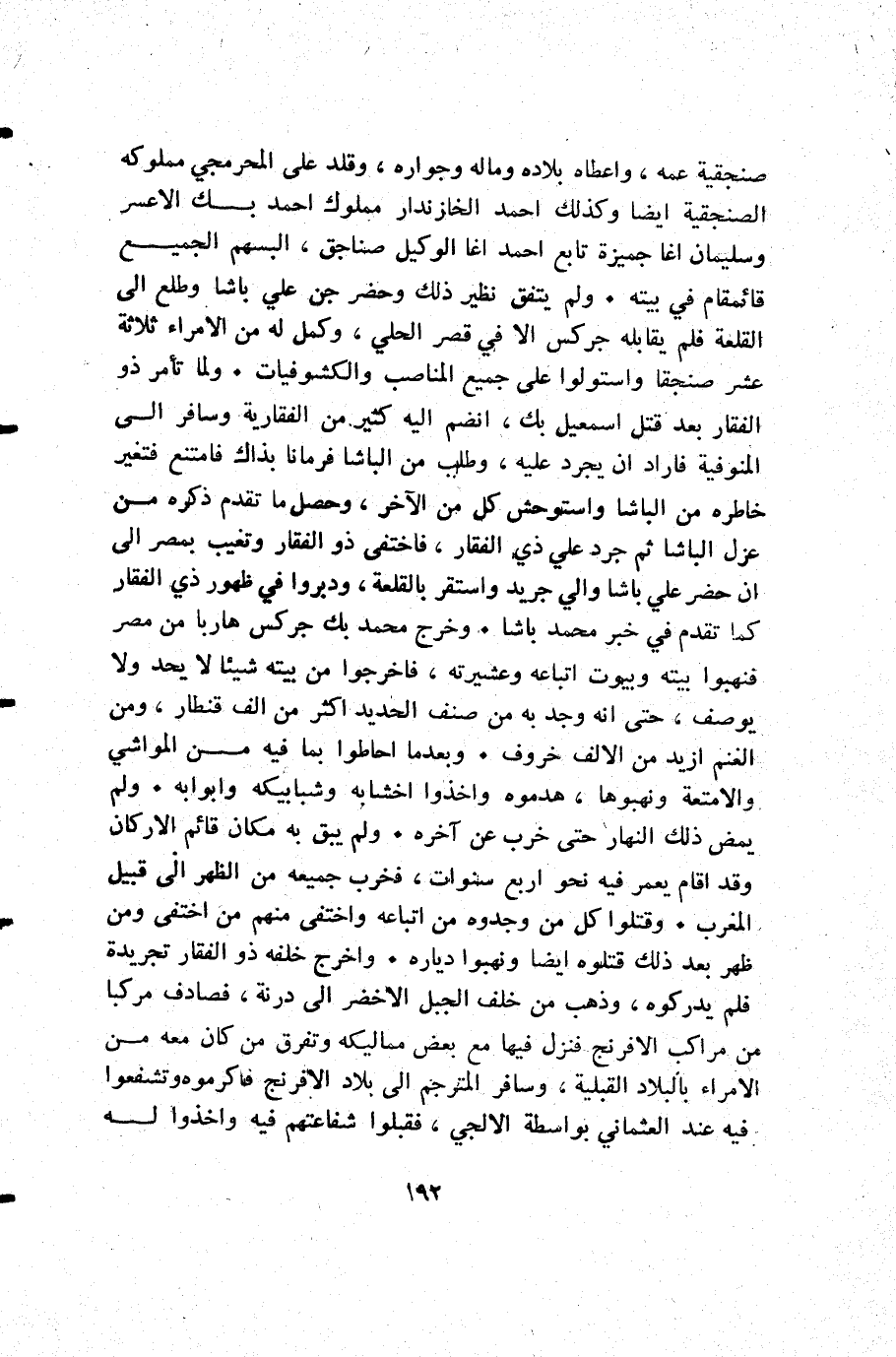 صنجقية عمه واعطاه بلاده وماله وجواره وقلد على المحرمجي مملوكه الصنجقية أيضا وكذلك أحمد الخازندار مملوك أحمد بك الاعسر وسليمان اغا جميزة تابع أحمد اغا الوكيل صناجق البسهم الجميع قائمقام في بيته. ولم يتفق نظير ذلك وحضر جن علي باشا وطلع إلى القلعة فلم يقابله جركس إلا في قصر الحلي وكمل له من الأمراء ثلاثة عشر صنجقا واستولوا على جميع المناصب والكشوفيات. ولما تأمر ذو الفقار بعد قتل إسمعيل بك انضم إليه كثير من الفقارية وسافر إلى المنوفية فاراد أن يجرد عليه وطلب من الباشا فرمانا بذاك فامتنع فتغير خاطره من الباشا واستوحش كل من الآخر وحصل ما تقدم ذكره من عزل الباشا ثم جرد علي ذي الفقار فاختفى ذو الفقار وتغيب بمصر إلى أن حضر علي باشا والي جريد واستقر بالقلعة ودبروا في ظهور ذي الفقار كما تقدم في خبر محمد باشا. وخرج محمد بك جركس هاربا من مصر فنهبوا بيته وبيوت اتباعه وعشيرته فاخرجوا من بيته شيئا لا يحد ولا يوصف حتى أنه وجد به من صنف الحديد أكثر من ألف قنطار ومن الغنم ازيد من الألف خروف. وبعدما احاطوا بما فيه من المواشي والأمتعة ونهبوها هدموه وأخذوا اخشابه وشبابيكه وأبوابه. ولم يمض ذلك النهار حتى خرب عن آخره. ولم يبق به مكان قائم الاركان وقد أقام يعمر فيه نحو أربع سنوات فخرب جميعه من الظهر إلى قبيل المغرب. وقتلوا كل من وجدوه من اتباعه واختفى منهم من اختفى ومن ظهر بعد ذلك قتلوه أيضا ونهبوا دياره. واخرج خلفه ذو الفقار تجريدة فلم يدركوه وذهب من خلف الجبل الأخضر إلى درنه فصادف مركبا من مراكب الافرنج فنزل فيها مع بعض مماليكه وتفرق من كان معه من الأمراء بالبلاد القبلية وسافر المترجم إلى بلاد الافرنج فاكرموه وتشفعوا فيه عند العثماني بواسطة الالجي فقبلوا شفاعتهم فيه وأخذوا له