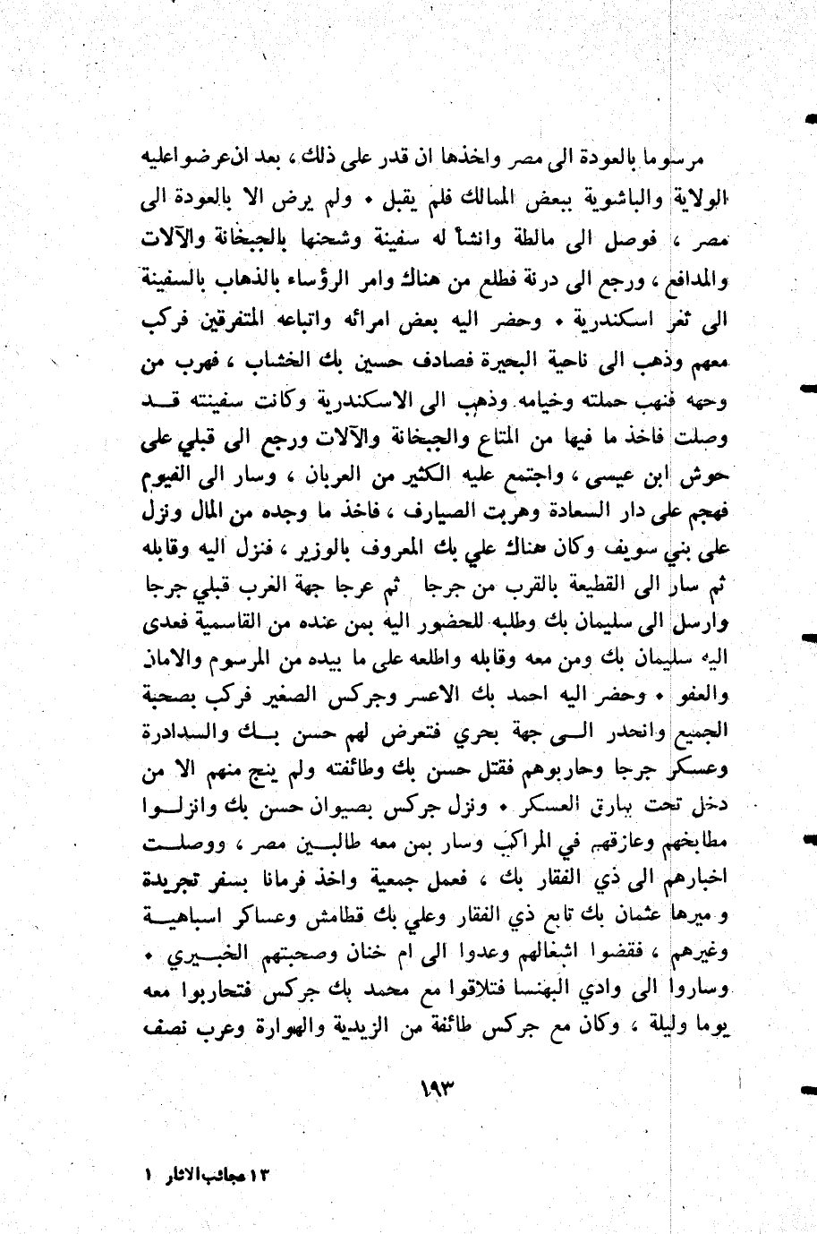 مرسوما بالعودة إلى مصر واخذها أن قدر على ذلك بعد أن عرضوا عليه الولاية والباشوية ببعض الممالك فلم يقبل. ولم يرض إلا بالعودة إلى مصر فوصل إلى مالطة وانشأ له سفينة وشحنها بالجبخانة والآلات والمدافع ورجع إلى درنة فطلع من هناك وأمر الرؤساء بالذهاب بالسفينة إلى ثغر اسكندرية. وحضر إليه بعض أمرائه واتباعه المتفرقين فركب معهم وذهب إلى ناحية البحيرة فصادف حسين بك الخشاب فهرب من وجهه فنهب حملته وخيامه وذهب إلى الأسكندرية وكانت سفينته قد وصلت فأخذ ما فيها من المتاع والجبخانة والآلات ورجع إلى قبلي على حوش ابن عيسى واجتمع عليه الكثير من العربان وسار إلى الفيوم فهجم على دار السعادة وهربت الصيارف فأخذ ما وجده من المال ونزل على بني سويف وكان هناك علي بك المعروف بالوزير فنزل إليه وقابله ثم سار إلى القطيعة بالقرب من جرجا ثم عرجا جهة الغرب قبلي جرجا وأرسل إلى سليمان بك وطلبه للحضور إليه بمن عنده من القاسمية فعدى إليه سليمان بك ومن معه وقابله واطلعه على ما بيده من المرسوم والامان والعفو. وحضر إليه أحمد بك الاعسر وجركس الصغير فركب بصحبة الجميع وانحدر إلى جهة بحري فتعرض لهم حسن بك والسدادرة وعسكر جرجا وحاربوهم فقتل حسن بك وطائفته ولم ينج منهم إلا من دخل تحت بيارق العسكر. ونزل جركس بصيوان حسن بك وانزلوا مطابخهم وعازقهم في المراكب وسار بمن معه طالبين مصر ووصلت اخبارهم إلى ذي الفقار بك فعمل جمعية وأخذ فرمانا بسفر تجريدة وأميرها عثمان بك تابع ذي الفقار وعلي بك قطامش وعساكر اسباهية وغيرهم فقضوا اشغالهم وعدوا إلى ام خنان وصحبتهم الخبيري. وساروا إلى وادي البهنسا فتلاقوا مع محمد بك جركس فتحاربوا معه يوما وليلة وكان مع جركس طائفة من الزيدية والهوارة وعرب نصف