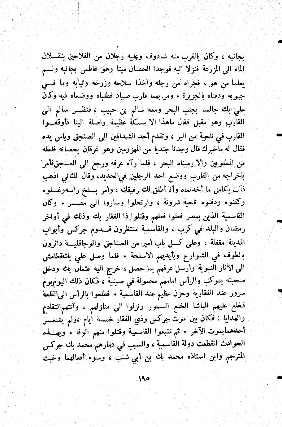 بجانبه وكان بالقرب منه شادوف وعليه رجلان من الفلاحين ينقلان الماء إلى المزرعة فنزلا إليه فوجدا الحصان ميتا وهو غاطس بجانبه ولم يعلما من هو فجراه من رجله وأخذا سلاحه وزرخه وثيابه وما في جيوبه ودفناه بالجزيرة. ومر بهما قارب صياد فطلباه ووضعاه فيه وكان علي بك جالسا بجنب البحر ومعه سالم بن حبيب فنظر سالم إلى القارب وهو مقبل فقال ما هذا إلا سمكة عظيمة وأصلة الينا فأوقفوا القارب في ناحية من البر وتقدم أحد الشدافين إلى الصنجق وباس يده فقال له: ما خبرك قال: وجدنا جنديا من المهزومين وهو غرقان بحصانه فلعله من المطلوبين وإلا رميناه البحر فلما رآه عرفه ورجع إلى الصنجق فأمر باخراجه من القارب ووضع أحد الرجلين في الحديد وقال للثاني: اذهب فآت بكامل ما أخذتماه وأنا أطلق لك رفيقك وأمر بسلخ رأسه وغسلوه وكفنوه ودفنوه ناحية شرونة وارتحلوا وساروا إلى مصر. وكان القاسمية الذين بمصر فعلوا فعلهم وقتلوا ذا الفقار بك وذلك في أواخر رمضان والبلد في كرب والقاسمية منتظرون قدوم جركس وأبواب المدينة مقفلة وعلى كل باب أمير من الصناجق والوجاقلية داثرون بالطوف في الشوارع وبأيديهم الأسلحة. فلما وصل علي بك قطامش إلى الآثار النبوية وأرسل عرفهم بما حصل خرج إليه عثمان بك ودخل صحبته بموكب والرأس إمامهم محمولة في صينية فكان ذلك اليوم يوم سرور عند الفقارية وحزن عظيم عند القاسمية. فطلعوا بالرأس إلى القلعة فخلع عليهم الباشا الخلع السمور ونزلوا إلى منازلهم وأتتهم التقادم والهدايا فكان بين موت جركس وذي الفقار خمسة أيام ولم يشعر أحدهما بموت الآخر. ثم تتبعوا القاسمية وقتلوا منهم الوفا. وبهذه الحوادث انقطعت دولة القاسمية والسبب في دمارهم محمد بك جركس المترجم وابن أستاذه محمد بك بن أبي شنب وسوء أفعالهما وخبث