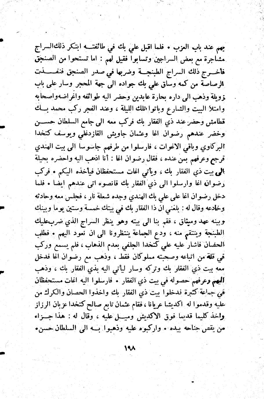 بهم عند باب االعزب. فلما أقبل علي بك في طائفته ابتكر ذلك السراج مشاجرة مع بعض السراجين وتسابوا فقيل لهم: اما تستحوا من الصنجق فأخرج ذلك السراج الطبنجة وضربها في صدر الصنجق علي بك جواده إلى جهة المحجر وسار على باب زويلة وذهب إلى داره بحارة عابدين وحضر إليه طوائفه واغراضه وأصحابه وامتلأ البيت والشارع وباتوا تلك الليلة وعند الفجر ركب محمد بك قطامش وحضر عند ذي الفقار بك فركب معه إلى جامع السلطان حسن وحضر عندهم رضوان اغا وعثمان جاويش القازدغلي ويوسف كتخدا البركاوي وباقي الأغوات فأرسلوا من طرفهم جاسوسا إلى بيت الهندي فرجع وعرفهم بمن عنده فقال رضوان اغا أنا أذهب إليه واحضره بحيلة إلى بيت ذي الفقار بك ويأتي اغات مستحفظان فيأخذه اليكم. فركب رضوان اغا وأرسلوا إلى ذي الفقار بك وقانصوه أتى عندهم أيضا. فلما دخل رضوان اغا على علي بك الهندي وده شعلة نار فجلس معه وحادثه وخادعه وقال له: بلغني أن ذو الفقار بك في بيتك خمسة وستين يوما وبينك وبينه عهد وميثاق فقم بنا إلى بيته وهو ينظر السراج الذي ضرب عليك الطبنجة وينتقم منه ودع الجماعة ينتظرونا إلى أن نعود اليهم. فطلب الحصان فاشار عليه علي كتخدا الجلفي بعدم الذهاب فلم يسمع وركب في قلة من اتباعه وصحبته مملوكان فقط وذهب مع رضوان اغا فدخل معه بيت ذي الفقار بك وتركه وسار ليأتي إليه بذي الفقار بك ذهب إليهم وعرفهم حصوله في بيت ذي الفقار. فأرسلوا إليه اغات مستحفظان في جماعة كثيرة فدخلوا بيت ذي الفقار بك وأخذوا الحصان والكرك من عليه وقدموا له أكديشا عريانا فقام عثمان تابع صالح كتخدا عزبان الرزاز وأخذ كليما قديما فوق الاكديش وميل عليه وقال له: هذا جزاء من يقص جناحه بيده. واركبوه عليه وذهبوا به إلى السلطان حسن.