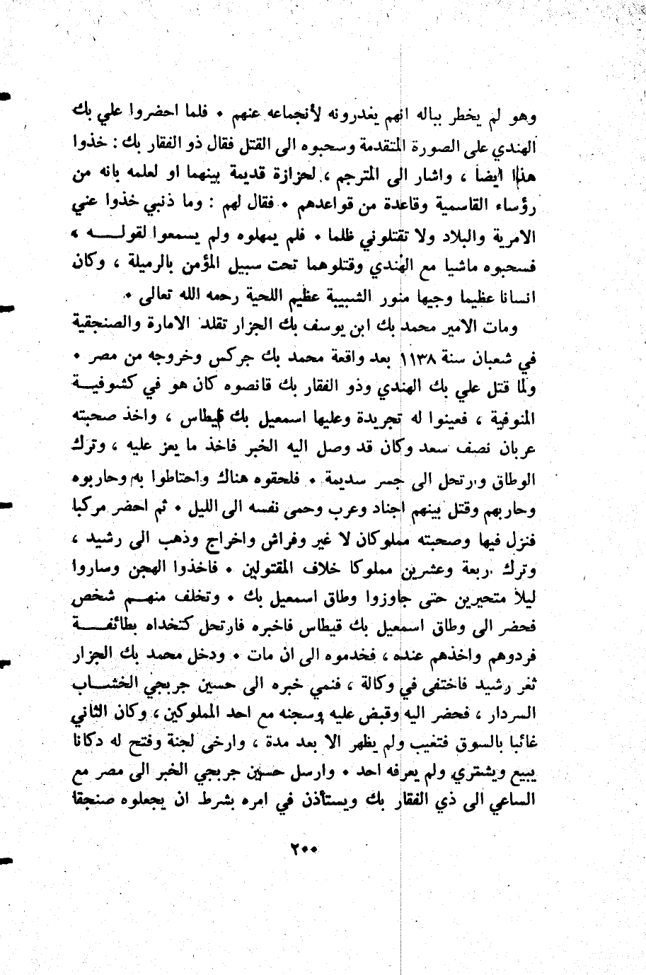 ومات الأمير محمد بك ابن يوسف بك الجزار تقلد الإمارة والصنجقية في شعبان سنة 1138 بعد واقعة محمد بك جركس وخروجه من مصر. ولما قتل علي بك الهندي وذو الفقار بك قانصوه كان هو في كشوفية المنوفية فعينوا له تجريدة وعليها إسمعيل بك قيطاس وأخذ صحبته عربان نصف سعد وكان قد وصل إليه الخبر فأخذ ما يعز عليه وترك الوطاق وارتحل إلى جسر سديمة. فلحقوه هناك واحتاطوا به وحاربوه وحاربهم وقتل بينهم اجناد وعرب وحمى نفسه إلى الليل. ثم أحضر مركبا فنزل فيها وصحبته مملوكان لا غير وفراش واخراج وذهب إلى رشيد وترك أربعة وعشرين مملوكا خلاف المقتولين. فأخذوا الهجن وساروا ليلا متحيرين حتى جاوزوا وطاق إسمعيل بك. وتخلف منهم شخص فحضر إلى وطاق إسمعيل بك قيطاس فاخبره فارتحل كتخداه بطائفة فردوهم واخذهم عنده فخدموه إلى أن مات. ودخل محمد بك الجزار ثغر رشيد فاختفى في وكالة فنمي خبره إلى حسين جربجي الخشاب السردار فحضر إليه وقبض عليه وسجنه مع أحد المملوكين وكان الثاني غائبا بالسوق فتغيب ولم يظهر إلا بعد مدة وارخى لجنة وفتح له دكانا يبيع ويشتري ولم يعرفه أحد. وأرسل حسين جربجي الخبر إلى مصر مع الساعي إلى ذي الفقار بك ويستأذن في امره بشرط أن يجعلوه صنجقا