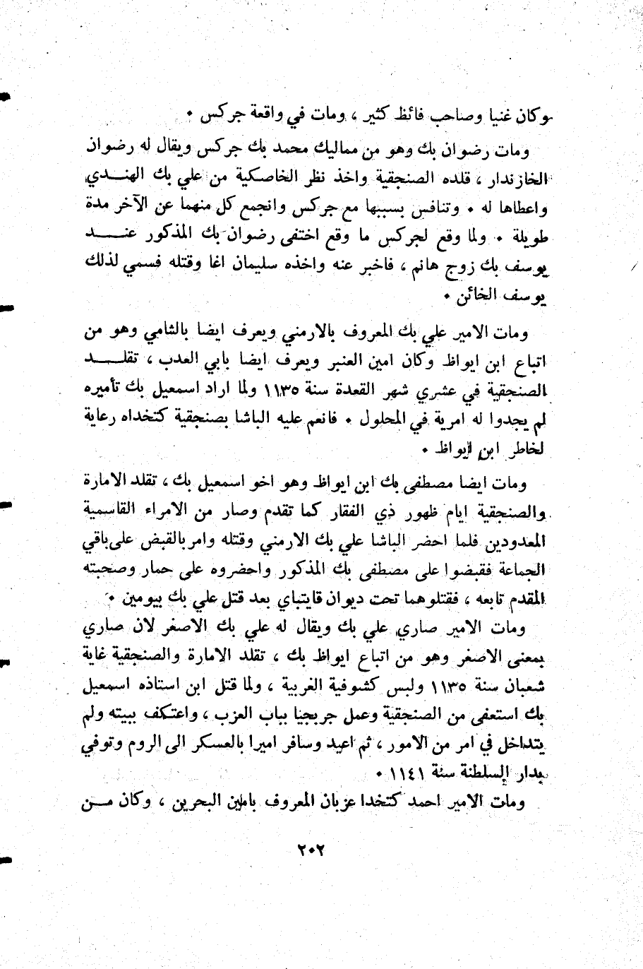 ومات الأمير علي بك المعروف بالارمني ويعرف أيضا بالشامي وهو من اتباع ابن ايواظ وكان امين العنبر ويعرف أيضا بابي العدب تقلد الصنجقية في عشري شهر القعدة سنة 1135 ولما أراد إسمعيل بك تأميره لم يجدوا له امرية في المحلول. فانعم عليه الباشا بصنجقية كتخداه رعاية لخاطر ابن ايواظ. ومات أيضا مصطفى بك ابن ايواظ وهو اخو إسمعيل بك تقلد الإمارة والصنجقية أيام ظهور ذي الفقار كما تقدم وصار من الأمراء القاسمية المعدودين فلما أحضر الباشا علي بك الارمني وقتله وأمر بالقبض على باقي الجماعة فقبضوا على مصطفى بك المذكور واحضروه على حمار وصحبته المقدم تابعه فقتلوهما تحت ديوان قايتباي بعد قتل علي بك بيومين.