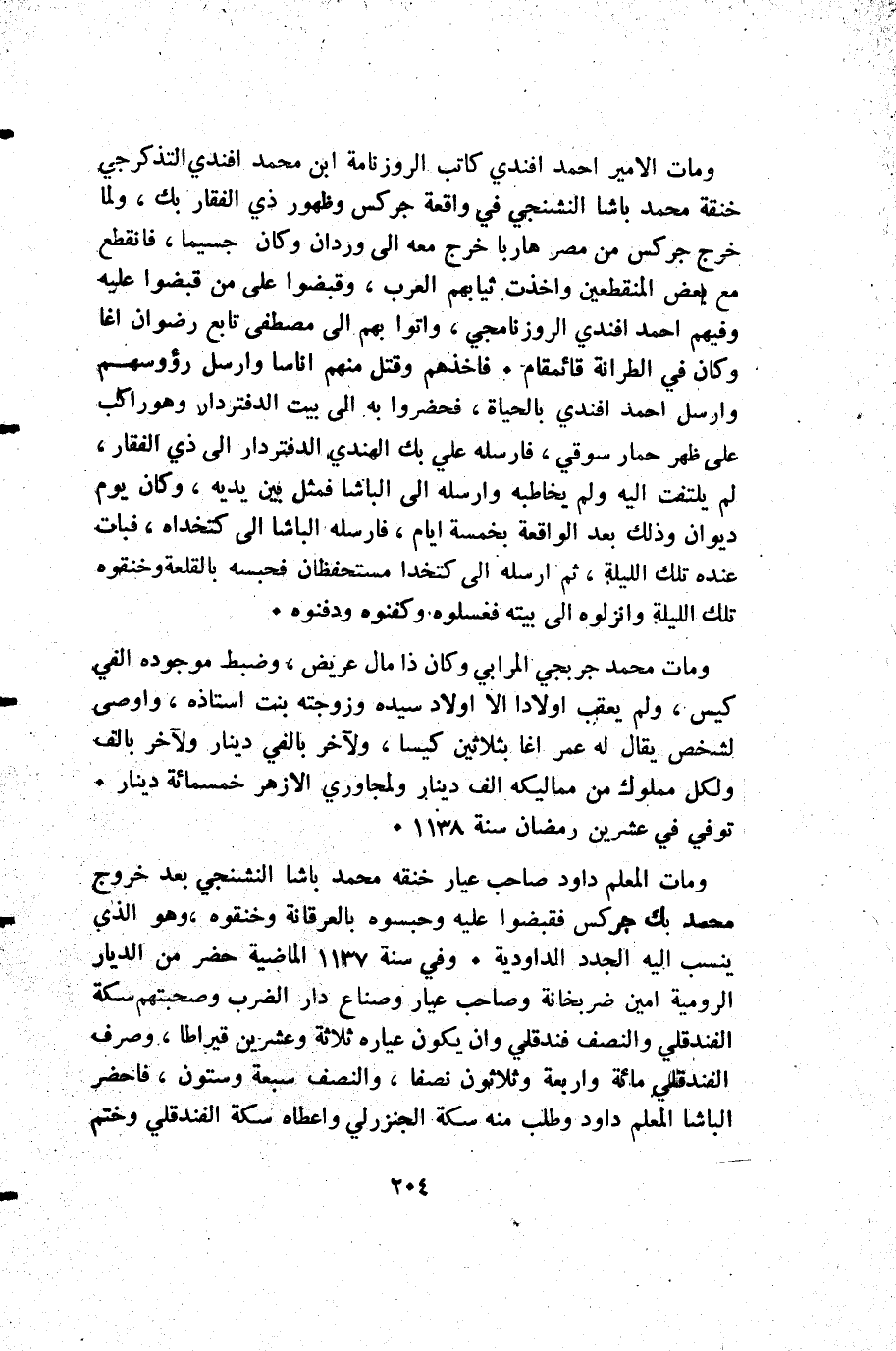 ومات المعلم داود صاحب عيار خنقه محمد باشا النشنجي بعد خروج محمد بك جركس فقبضوا عليه وحبسوه بالعرقانة وخنقوه وهو الذي ينسب إليه الجدد الداودية. وفي سنة 1137 الماضية حضر من الديار الرومية امين ضربخانة وصاحب عيار وصناع دار الضرب وصحبتهم سكة الفندقلي والنصف فندقلي وإن يكون عياره ثلاثة وعشرين قيراطا وصرف الفندقلي مائة وأربعة وثلاثون نصفا والنصف سبعة وستون فاحضر الباشا المعلم داود وطلب منه سكة الجنزرلي واعطاه سكة الفندقلي وختم