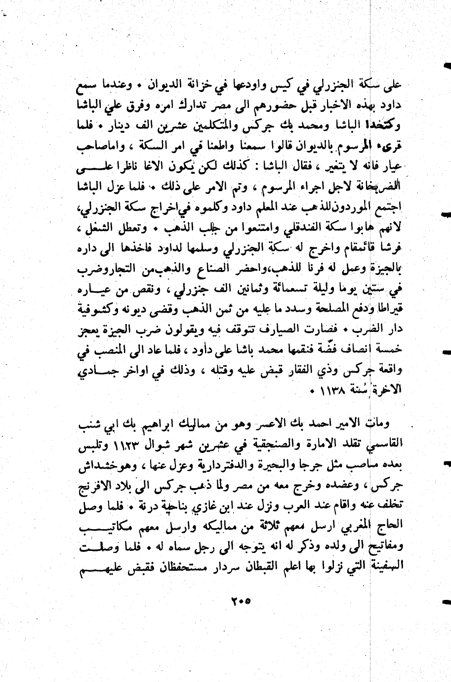 على سكة الجنزرلي في كيس وأودعها في خزانة الديوان. وعندما سمع داود بهذه الأخبار قبل حضورهم إلى مصر تدارك امره وفرق علي الباشا وكتخدا الباشا ومحمد بك جركس والمتكلمين عشرين ألف دينار. فلما قرىء المرسوم بالديوان قالوا: سمعنا واطعنا في أمر السكة وأما صاحب عيار فإن لا يتغير فقال الباشا: كذلك لكن يكون الأغا ناظرا على الضربخانة لاجل اجراء المرسوم وتم الأمر على ذلك. فلما عزل الباشا اجتمع الموردون للذههب عند المعلم داود وكلموه في اخراج سكة الجنزرلي لأنهم هابوا سكة الفندقلي وامتنعوا من جلب الذهب. وتعطل الشغل فرشا قائمقام واخرج له سكة الجنزرلي وسلمها لداود فأخذها إلى داره بالجيزة وعمل له فرمانا للذهب واحضر الصناع والذهب من التجار وضرب في ستين يوما وليلة تسعمائة وثمانين ألف جنزرلي ونقص من عياره قيراطا ودفع المصلحة وسدد ما عليه من ثمن الذهب وقضى ديونه وكشوفية دار الضرب. فصارت الصيارف تتوقف فيه ويقولون ضرب الجيزة يعجز خمسة انصاف فضة فنقمها محمد باشا على داود فلما عاد إلى المنصب في واقعة جركس وذي الفقار قبض عليه وقتله وذلك في أواخر جمادي الاخرة سنة 1138.