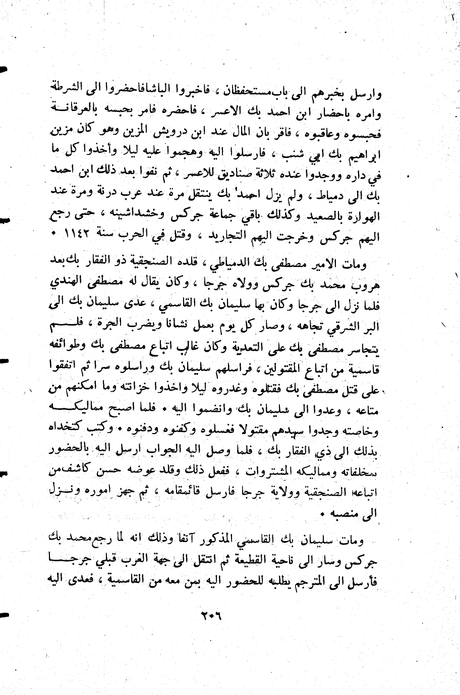 وأرسل بخبرهم إلى باب مستحفظان فأخبروا الباشا فاحضروا إلى الشرطة وأمره باحضار ابن أحمد بك الاعسر فاحضره فامر بحبسه بالعرقانة فحبسوه وعاقبوه فاقر بان المال عند ابن درويش المزين وهو كان مزين إبراهيم بك أبي شنب فأرسلوا إليه وهجموا عليه ليلا وأخذوا كل ما في داره ووجدوا عنده ثلاثة صناديق للاعسر ثم نفوا بعد ذلك ابن أحمد بك إلى دمياط ولم يزل أحمد بك ينتقل مرة عند عرب درنة ومرة عند الهوارة بالصعيد وكذلك باقي جماعة جركس وخشداشينه حتى رجع إليهم جركس وخرجت إليهم التجاريد وقتل في الحرب سنة 1142.