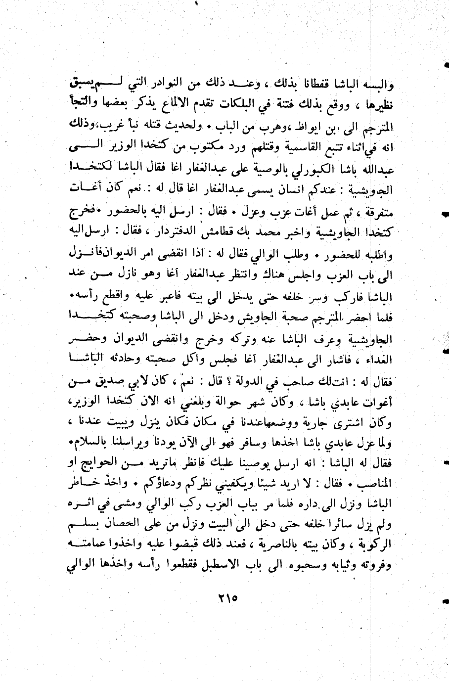 والبسه الباشا قفطانا بذلك وعند ذلك من النوادر التي لم يسبق نظيرها ووقع بذلك فتنة في البلكات تقدم الالماع يذكر بعضها والتجأ المترجم إلى ابن ايواظ وهرب من الباب. ولحديث قتلة نبأ غريب وذلك أنه في اثناء تتبع القاسمية وقتلهم ورد مكتوب من كتخدا الوزير إلى عبد الله باشا الكبورلي بالوصية على عبد الغفار اغا فقال الباشا لكتخدا الجاويشية عندكم إنسان يسمى عبد الغفار اغا قال له: نعم كان اغات متفرقة ثم عمل اغات عزب وعزل. فقال أرسل إليه بالحضور. فخرج كتخدا الجاويشية واخبر محمد بك قطامش الدفتردار فقال أرسل إليه واطلبه للحضور. وطلب الوالي فقال له: إذا انقضى أمر الديوان فأنزل إلى باب العزب واجلس هناك وانتظر عبد الغفار اغا وهو نازل من عند الباشا فاركب وسر خلفه حتى يدخل إلى بيته فاعبر عليه واقطع رأسه. فلما أحضر المترجم صحبة الجاويش ودخل إلى الباشا وصحبته كتخدا الجاويشية وعرف الباشا عنه وتركه وخرج وانقضى الديوان وحضر الغداء فاشار إلى عبد الغفار اغا فجلس وأكل صحبته وحادثه الباشا فقال له: أنت لك صاحب في الدولة قال: نعم كان لأبي صديق من أغوات عابدي باشا وكان شهر حوالة وبلغني أنه الآن كتخدا الوزير وكان اشترى جارية ووضعها عندنا في مكان فكان ينزل ويبيت عندنا ولما عزل عابدي باشا اخذها وسافر فهو إلى الآن يودنا ويراسلنا بالسلام. فقال له: الباشا أنه أرسل يوصينا عليك فانظر ما تريد من الحوايج أو المناصب. فقال لا اريد شيئا ويكفيني نظركم ودعاؤكم. واخذ خاطر الباشا ونزل إلى داره فلما مر بباب العزب ركب الوالي ومشى في اثره ولم يزل سائرا خلفه حتى دخل إلى البيت ونزل من على الحصان بسلم الركوبة وكان بيته بالناصرية فعند ذلك قبضوا عليه وأخذوا عمامته وفروته وثيابه وسحبوه إلى باب الأسطبل فقطعوا رأسه واخذها الوالي