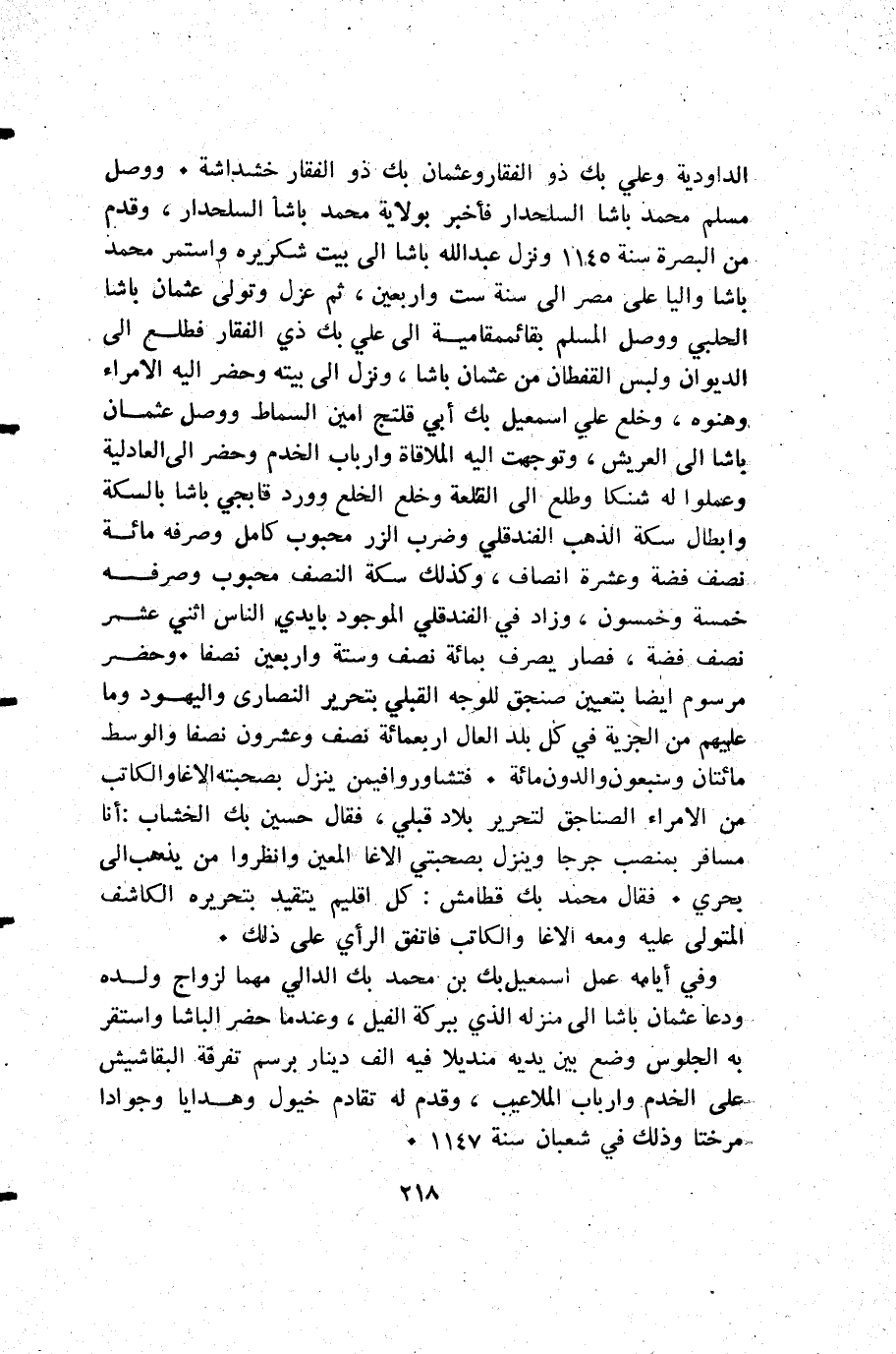 الداودية وعلي بك ذو الفقار وعثمان بك ذو الفقار خشداشة. ووصل مسلم محمد باشا السلحدار فأخبر بولاية محمد باشا السلحدار وقدم من البصرة سنة 1145 ونزل عبد الله باشا إلى بيت شكريره واستمر محمد باشا واليا على مصر إلى سنة ست وأربعين ثم عزل وتولى عثمان باشا الحلبي ووصل المسلم بقائمقامية إلى علي بك ذي الفقار فطلع إلى الديوان ولبس القفطان من عثمان باشا ونزل إلى بيته وحضر إليه الأمراء وهنوه وخلع علي إسمعيل بك أبي قلتج امين السماط ووصل عثمان باشا إلى العريش وتوجهت إليه الملاقاة وأرباب الخدم وحضر إلى العادلية وعملوا له شنكا وطلع إلى القلعة وخلع الخلع وورد قابجي باشا بالسكة وابطال سكة الذهب الفندقلي وضرب الزر محبوب كامل وصرفه مائة نصف فضة وعشرة انصاف وكذلك سكة النصف محبوب وصرفه خمسة وخمسون وزاد في الفندقلي الموجود بايدي الناس اثني عشر نصف فضة فصار يصرف بمائة نصف وستة وأربعين نصفا. وحضر مرسوم أيضا بتعيين صنجق للوجه القبلي بتحرير النصارى واليهود وما عليهم من الجزية في كل بلد العال أربعمائة نصف وعشرون نصفا والوسط مائتان وسبعون والدون مائة. فتشاوروا فيمن ينزل بصحبته الأغا والكاتب من الأمراء الصناجق لتحرير بلاد قبلي فقال حسين بك الخشاب أنا مسافر بمنصب جرجا وينزل بصحبتي الأغا المعين وانظروا من يذهب إلى بحري. فقال محمد بك قطامش كل اقليم يتقيد بتحريره الكاشف المتولى عليه ومعه الأغا والكاتب فاتفق الرأي على ذلك.