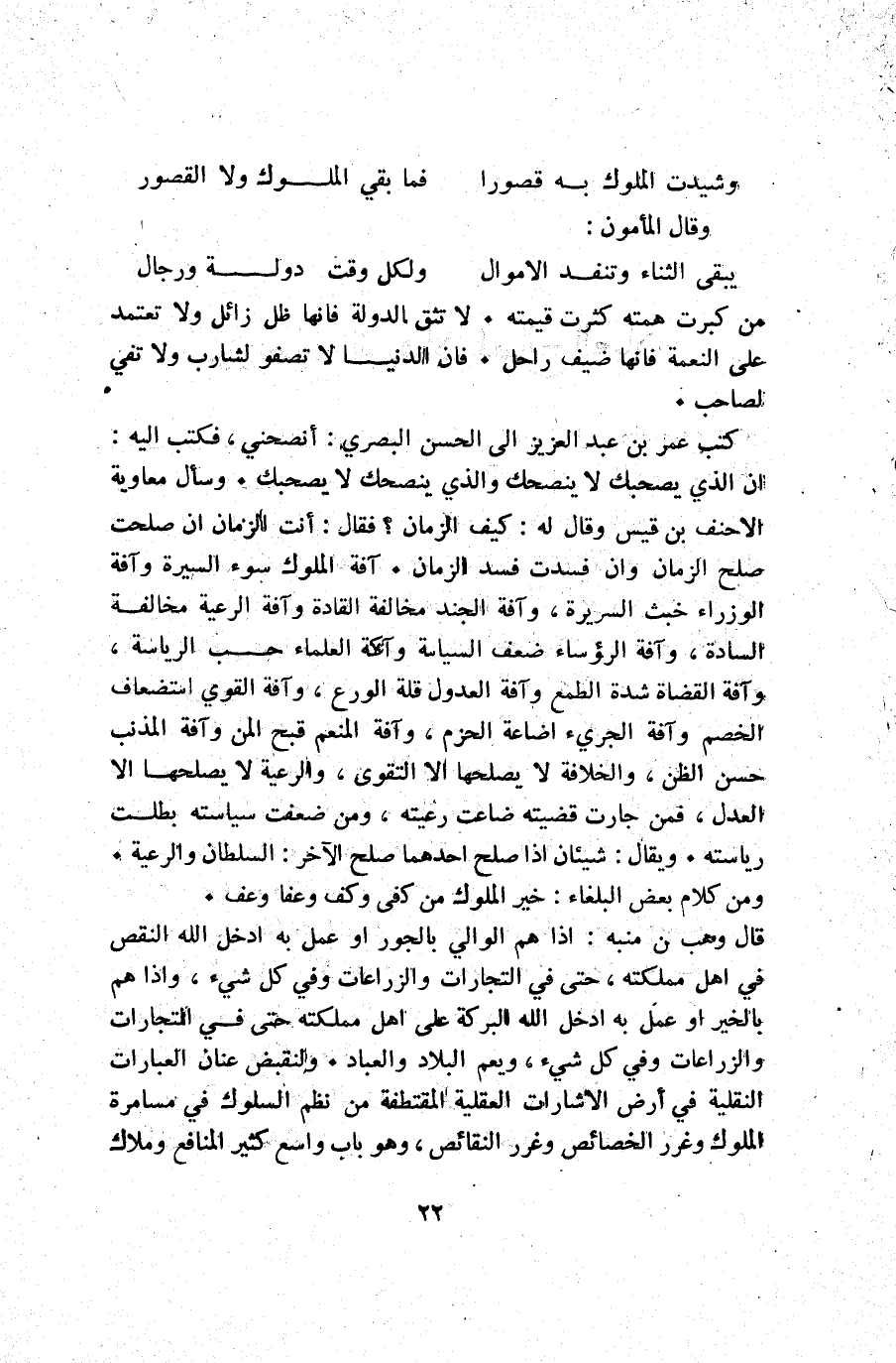 قال وهب بن منبه: إذا هم الوالي بالجور أو عمل به ادخل الله النقص في أهل مملكته حتى في التجارات والزراعات وفي كل شيء وإذا هم بالخير أو عمل به ادخل الله البركة على أهل مملكته حتى في التجارات والزراعات وفي كل شيء ويعم البلاد والعباد. ولنقبض عنان العبارات النقلية في أرض الأشارات العقلية المقتطفة من نظم السلوك في مسامرة الملوك وغرر الخصائص وغرر النقائص وهو باب واسع كثير المنافع وملاك
