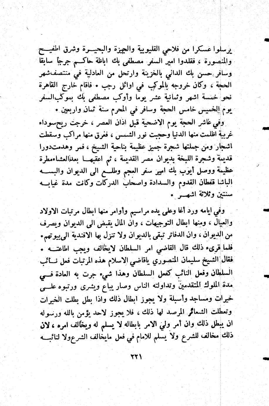 وفي أيامه ورد أغا وعلى يده مراسيم وأوامر منها ابطال مرتبات الأولاد والعيال ومنها ابطال التوجيهات وإن المال يقبض إلى الديوان ويصرف من الديوان وإن الدفاتر تبقى بالديوان ولا تنزل بها الافندية إلى بيوتهم. فلما قرىء ذلك قال القاضي: أمر السلطان لا يخالف ويجب اطاعته. فقال الشيخ سليمان المنصوري يا قاضي الإسلام هذه المرتبات فعل نائب السلطان وفعل النائب كفعل السلطان وهذا شيء جرت به العادة في مدة الملوك المتقدمين وتداولته الناس وصار يباع ويشرى ورتبوه على خيرات ومساجد وأسبلة ولا يجوز ابطال ذلك وإذا بطل بطلت الخيرات وتعطلت الشعائر المرصد لها ذلك فلا يجوز لاحد يؤمن بالله ورسوله ابن يبطل ذلك وإن أمر ولي الأمر بابطاله لا يسلم له ويخالف أمره لأن ذلك مخالف للشرع ولا يسلم للإمام في فعل ما يخالف الشرع ولا لنائبه