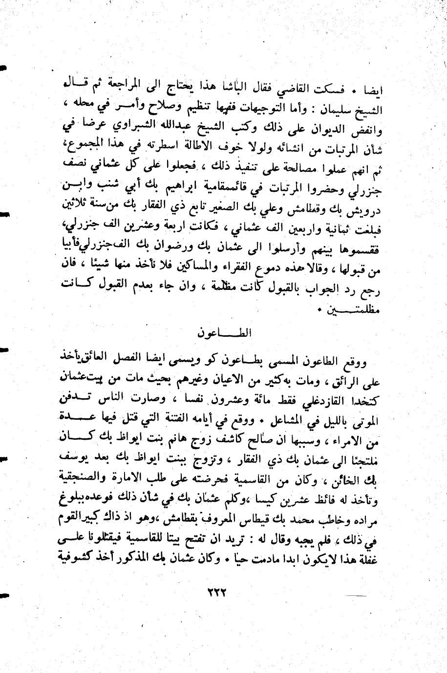 أيضا. فسكت القاضي فقال الباشا هذا يحتاج إلى المراجعة ثم قال الشيخ سليمان: وأما التوجيهات ففيها تنظيم وصلاح وأمر في محله وانفض الديوان على ذلك وكتب الشيخ عبد الله الشبراوي عرضا في شأن المرتبات من انشائه ولولا خوف الاطالة اسطرته في هذا المجموع ثم إنهم عملوا مصالحة على تنفيذ ذلك فجعلوا على كل عثماني نصف جنزرلي وحضروا المرتبات في قائمقامية إبراهيم بك أبي شنب وابن درويش بك وقطامش وعلي بك الصغير تابع ذي الفقار بك من سنة ثلاثين فبلغت ثمانية وأربعين ألف عثماني فكانت أربعة وعشرين ألف جنزرلي فقسموها بينهم وأرسلوا إلى عثمان بك ورضوان بك ألف جنزرلي فأبيا من قبولها وقالا هذه دموع الفقراء والمساكين فلا نأخذ منها شيئا فإن رجع رد الجواب بالقبول كانت مظلمة وإن جاء بعدم القبول كانت مظلمتين.