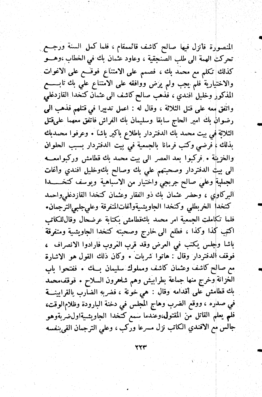 المنصورة فأنزل فيها صالح كاشف قائمقام فلما كمل السنة ورجع تحركت الهمة إلى طلب الصنجقية وعاود عثمان بك في الخطاب وهو كذلك تكلم مع محمد بك فصمم على الامتناع فوقع على الأغوات والاختيارية فلم يجب ولم يرض ووافقه على الامتناع علي بك تابع المذكور وخليل افندي فذهب صالح كاشف إلى عثمان كتخدا القازدغلي واتفق معه على قتل الثلاثة وقال له: اعمل تدبيرا في قتلهم فذهب إلى رضوان بك أمير الحاج سابقا وسليمان بك الفراش فاتفق معهما على قتل الثلاثة في بيت محمد بك الدفتردار باطلاع باكير باشا. وعرفوا محمد بك بذلك فرضي وكتب فرمانا بالجمعية في بيت الدفتردار بسبب الحلوان والخزينة. فركبوا بعد العصر إلى بيت محمد بك قطامش وركبوا معه إلى بيت الدفتردار وصحبتهم علي بك وصالح بك وخليل افندي وأغات الجملية وعلي صالح جربجي واختيار من الأسباهية ويوسف كتخدا البركاوي وحضر عثمان بك ذو الفقار وعثمان كتخدا القازدغلي وأحمد كتخدا الخربطلي وكتخدا الجاويشية وأغات المتفرقة وعلي جلبي الترجمان. فلما تكاملت الجمعية أمر محمد بك قطامش بكتابة عرضحال وقال للكاتب أكتب كذا وكذا فطلع إلى خارج وصحبته كتخدا الجاويشية ومتفرقة باشا وجلس يكتب في العرض وقد قرب الغروب فارادوا الانصراف فوقف الدفتردار وقال هاتوا شربات. وكان ذلك القول هو الأشارة مع صالح كاشف وعثمان كاشف ومملوك سليمان بك. ففتحوا باب الخزانة وخرج منها جماعة بطرابيش وهم شاهرون السلاح. فوقف محمد بك قطامش على أقدامه وقال هي خونة فضربه الضارب بالقرابينة في صدره ووقع الضرب وهاج المجلس في دخنة البارودة وظلام الوقت فلم يعلم القاتل من المقتول وعندما سمع كتخدا الجاويشية أول ضربة وهو جالس مع الافندي الكاتب نزل مسرعا وركب وعلي الترجمان القى بنفسه