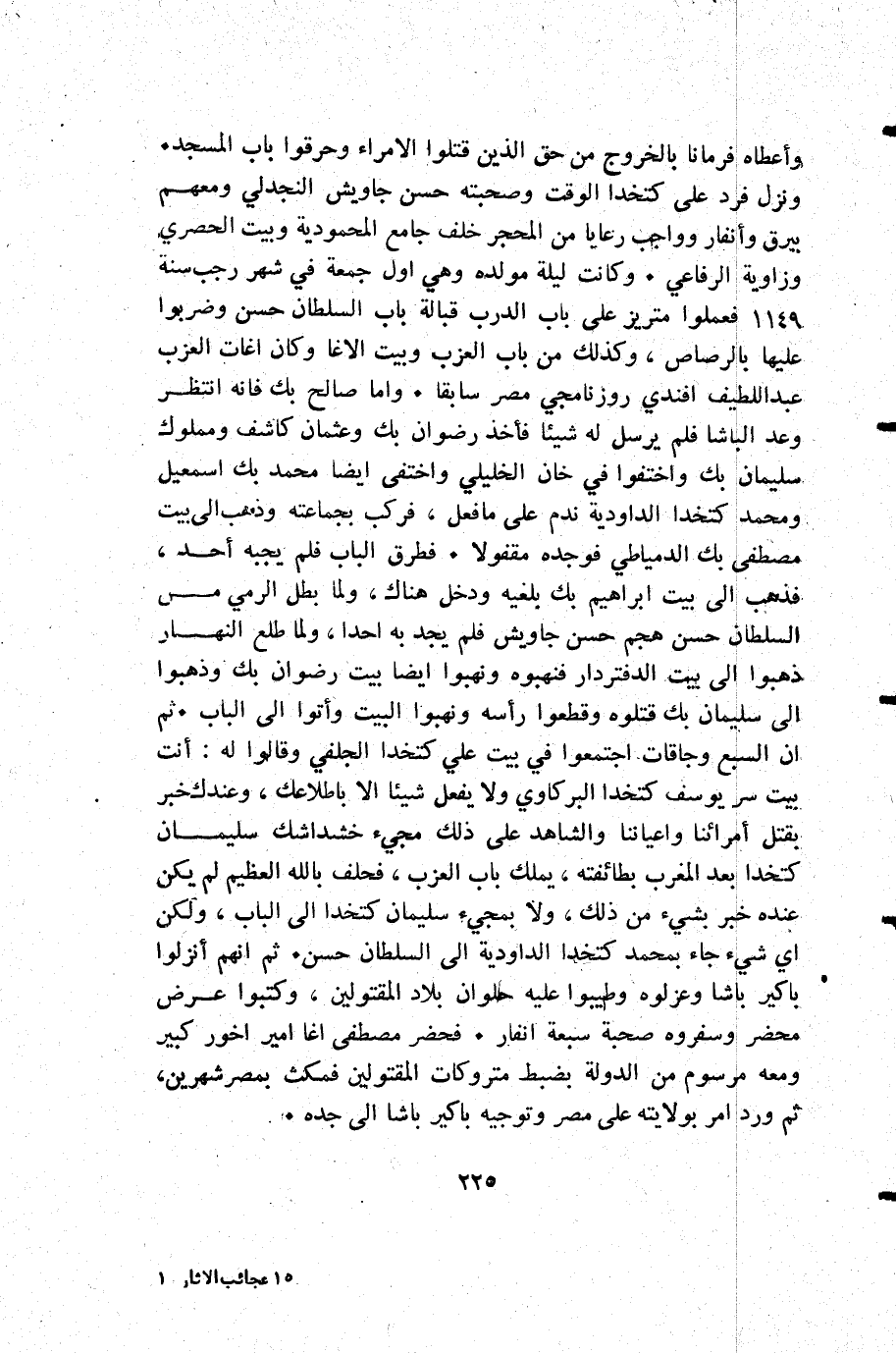 وأعطاه فرمانا بالخروج من حق الذين قتلوا الأمراء وحرقوا باب المسجد. ونزل فرد على كتخدا الوقت وصحبته حسن جاويش النجدلي ومعهم بيرق وأنفار وواجب رعايا من المحجر خلف جامع المحمودية وبيت الحصري وزاوية الرفاعي. وكانت ليلة مولده وهي أول جمعة في شهر رجب سنة 1149 فعلموا متريز على باب الدرب قبالة باب السلطان حسن وضربوا عليها بالرصاص وكذلك من باب العزب وبيت الأغا وكان اغات العزب عبد اللطيف افندي روزنامجي مصر سابقا. وأما صالح بك فإنه انتظر وعد الباشا فلم يرسل له شيئا فأخذ رضوان بك وعثمان كاشف ومملوك سليمان بك واختفوا في خان الخليلي واختفى أيضا محمد بك إسمعيل ومحمد كتخدا الداودية ندم على ما فعل فركب بجماعته وذهب إلى بيت مصطفى بك الدمياطي فوجده مقفولا. فطرق الباب فلم يجبه أحد فذهب إلى بيت إبراهيم بك بلغيه ودخل هناك ولما بطل الرمي من السلطان حسن هجم حسن جاويش فلم يجد به أحدا ولما طلع النهار ذهبوا إلى بيت الدفتردار فنهبوه ونهبوا أيضا بيت رضوان بك وذهبوا إلى سليمان بك قتلوه وقطعوا رأسه ونهبوا البيت وأتوا إلى الباب. ثم أن السبع وجاقات اجتمعوا في بيت علي كتخدا الجلفي وقالوا له: أنت بيت سر يوسف كتخدا البركاوي ولا يفعل شيئا إلا باطلاعك وعندك خبر بقتل أمرائنا واعياننا والشاهد على ذلك مجيء خشداشك سليمان كتخدا بعد المغرب بطائفته يملك باب العزب فحلف بالله العظيم لم يكن عنده خبر بشيء من ذلك ولا بمجيء سليمان كتخدا إلى الباب ولكن أي شيء جاء بمحمد كتخدا الداودية إلى السلطان حسن. ثم إنهم أنزلوا باكير باشا وعزلوه وطيبوا عليه حلوان بلاد المقتولين وكتبوا عرض محضر وسفروه صحبة سبعة أنفار. فحضر مصطفى اغا أمير اخور كبير ومعه مرسوم من الدولة بضبط متروكات المقتولين فمكث بمصر شهرين ثم ورد أمر بولايته على مصر وتوجيه باكير باشا إلى جده.