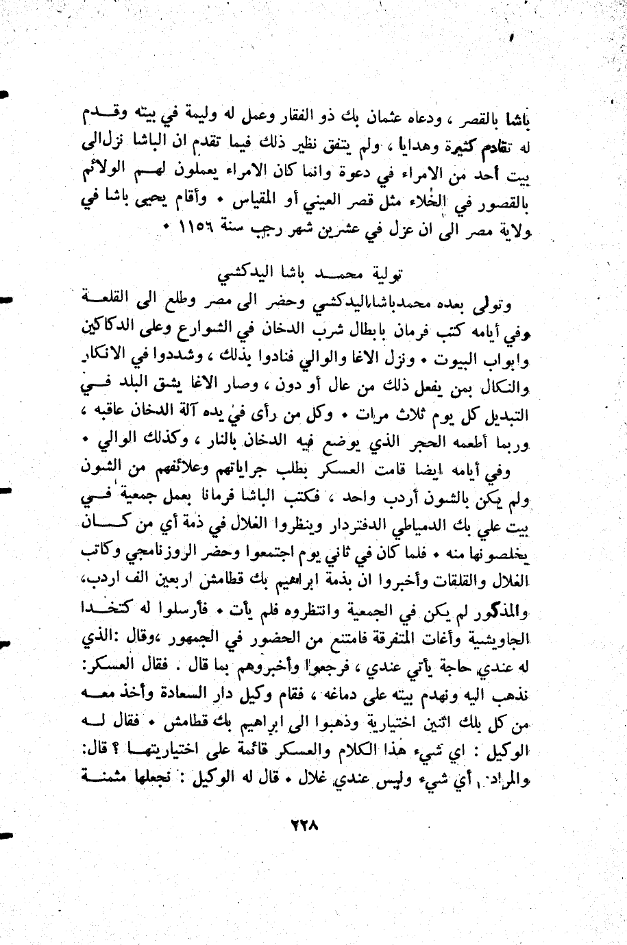 وتولى بعده محمد باشا اليدكشى وحضر إلى مصر وطلع إلى القلعه وفي أيامة كتب فرمان بابطال شرب الدخان في الشوارع وعلى الدكاكين وابواب البيوت. ونزل الأغا والو إلى فنادوا بذلك وشددوا في الانكار والنكال بمن يفعل ذلك من عال أو دون وصار الأغا يشق البلد في التبديل كل يوم ثلاث مرات. وكل من راى في يده الة الدخان عاقبه وربما اطعمه الحجر الذى يوضع فيه الدخان بالنار وكذلك الوالي. وفى أيامه أيضا قامت العسكر بطلب جراياتهم وعلائفهم من الشون ولم يكن بالشون أردب واحد فكتب الباشا فرمانا بعمل جمعية في بيت علي بك الدمياطى الدفتردار وينظروا الغلال في ذمة أي من كان يخلصونها منه. فلما كان في ثانى يوم اجتمعوا وحضر الروزنامجى وكاتب الغلال والقلقات واخبروة أن بذمة إبراهيم بك قطامش أربعين ألف اردب والمذكور لم يكن في الجمعيه وانتظروه فلم يات. فأرسلوا له كتخدا الجاويشيه واغات المتفرقة فامتنع من الحضور في الجمهور وقال الذي له عندي حاجة يأتي عندي قرجعوا واخبروهم بما قال. فقال العسكر نذهب إليه ونهدم بيته على دماغه فقام وكيل دار السعادة وأخذ معه من كل بلك اثنين اختيارية وذهبوا إلى إبراهيم بك قطامش. فقال له: الوكيل أي شيء هذا الكلام والعسكر قائمة علىاختيارتها قال: والمراد أى شيء وليس عندى غلال. قال له: الوكيل نجعلها مثمنة