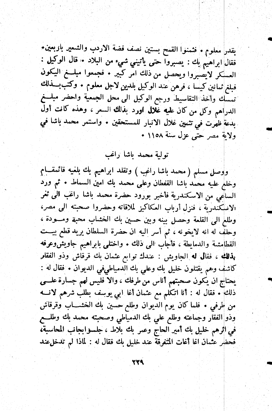 بقدر معلوم. فثمنوا القمح بستين نصف فضة الأردب والشعير باربعين. فقال إبراهيم بك يصبروا حتى يأتينى شيء من البلاد. قال الوكيل العسكر: لا يصبروا ويحضل من ذلك أمر كبير. فجمعوا ميلغ اليكون فبلغ ثمانين كيسا فرهن عند الوكيل بلدين لاجل معلوم. وكتب بذلك تمسك وأخذ التقاسيط ورجع الوكيل إلى محل الجمعية واحضر مبلغ الدارهم وكل من كان عليه غلال اورد بذلك السعر وهده كانت أول بدعة ظهرت في تثمين غلال الأنبار للمستحقين. واستمر محمد باشا في ولاية مصر حتى عزل سنة 1158.