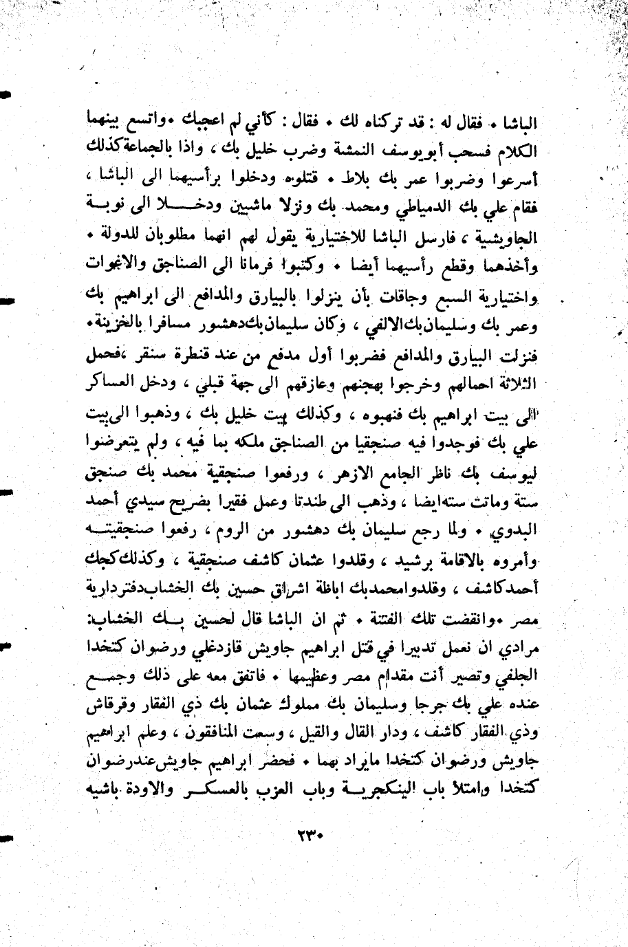 الباشا. فقال له: قد تركناه لك. فقال كأني لم اعجبك. واتسع بينهما الكلام فسحب أبو يوسف النمشة وضرب خليل بك وإذا بالجماعة كذلك أسرعوا وضربوا عمر بك بلاط. قتلوه ودخلوا برأسيهما إلى الباشا فقام علي بك الدمياطي ومحمد بك ونزلا ماشيين ودخلا إلى نوبة الجاويشية فأرسل الباشا للاختيارية يقول لهم: إنهما مطلوبان للدولة. وأخذهما وقطع رأسيهما أيضا. وكتبوا فرمانا إلى الصناجق والاغوات واختيارية السبع وجاقات بأن ينزلوا بالبيارق والمدافع إلى إبراهيم بك وعمر بك وسليمان بك الالفي وكان سليمان بك دهشور مسافرا بالخزينة. فنزلت البيارق والمدافع فضربوا أول مدفع من عند قنطرة سنقر فحمل الثلاثة احمالهم وخرجوا بهجنهم وعازقهم إلى جهة قبلي ودخل العساكر إلى بيت إبراهيم بك فنهبوه وكذلك بيت خليل بك وذهبوا إلى بيت علي بك فوجدوا فيه صنجقيا من الصناجق ملكة بما فيه ولم يتعرضوا ليوسف بك ناظر الجامع الأزهر ورفعوا صنجقية محمد بك صنجق ستة وماتت سته أيضا وذهب إلى طندتا وعمل فقيرا بضريح سيدي أحمد البدوي. ولما رجع سليمان بك دهشور من الروم رفعوا صنجقيته وأمروه بالاقامة برشيد وقلدوا عثمان كاشف صنجقية وكذلك كجك أحمد كاشف وقلدوا محمد بك اباظة اشراق حسين بك الخشاب دفتردارية مصر. وانقضت تلك الفتنة. ثم أن الباشا قال لحسين بك الخشاب مرادي: أن نعمل تدبيرا في قتل إبراهيم جاويش قازدغلي ورضوان كتخدا الجلفي وتصير أنت مقدام مصر وعظيمها. فاتفق معه على ذلك وجمع عنده علي بك جرجا وسليمان بك مملوك عثمان بك ذي الفقار وقرقاش وذي الفقار كاشف ودار القال والقيل وسعت المنافقون وعلم إبراهيم جاويش ورضوان كتخدا ما يراد بهما. فحضر إبراهيم جاويش عند رضوان كتخدا وامتلأ باب الينكجرية وباب العزب بالعسكر والأودة باشية.