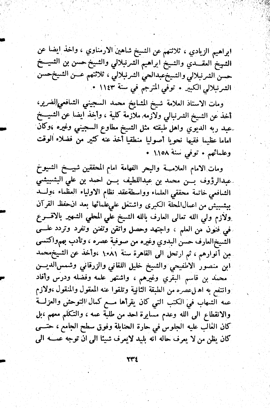 ومات الأستاذ العلامة شيخ المشايخ محمد السجيني الشافعي الضرير أخذ عن الشيخ الشرنبالي ولازمه ملازمة كلية وأخذ أيضا عن الشيخ عبد ربه الديوي وأهل طبقته مثل الشيخ مطاوع السجيني وغيره وكان إماما عظيما فقيها نحويا أصوليا منطقيا أخذ عنه كثير من فضلاء الوقت وعلمائهم. توفي سنة 1158.