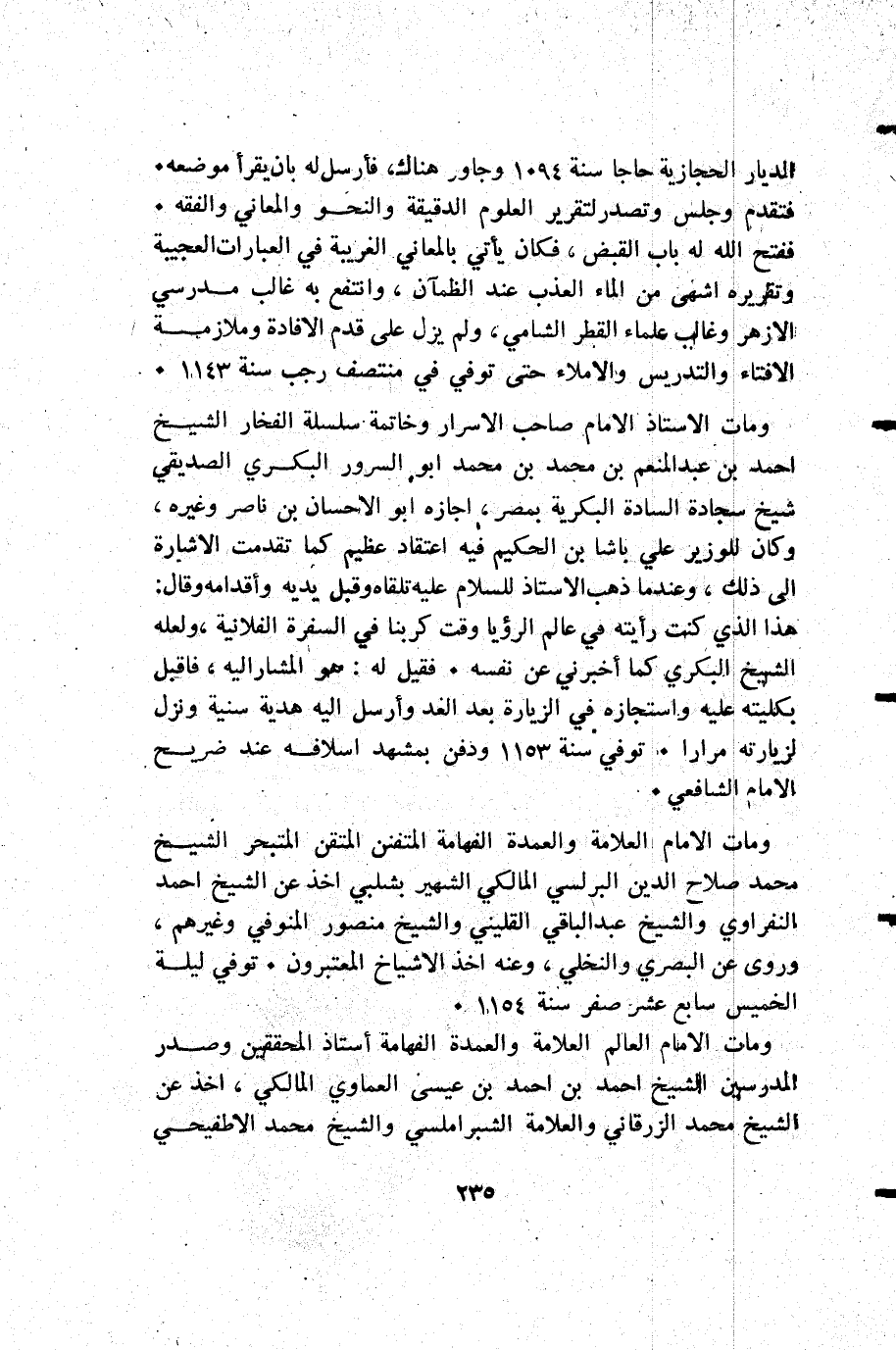 ومات الإمام العلامة والعمدة الفهامة المتقنن المتفن المتبحر الشيخ محمد صلاح الدين البرلسي المالكي الشهير بشلبي أخذ عن الشيخ أحمد النفراوي والشيخ عبد الباقي القليني والشيخ منصور المنوفي وغيرهم وروى عن البصري والنخلي وعنه أخذ الأشياخ المعتبرون. توفي ليلة الخميس سابع عشر صفر سنة 1154.