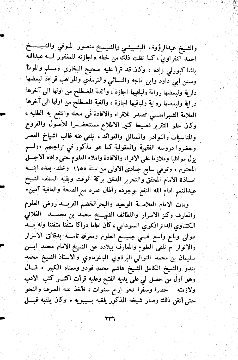 ومات الإمام العلامة الوحيد والبحر الخضم الفريد روض العلوم والمعارف وكنز الأسرار واللطائف الشيخ محمد بن محمد الغلاني الكثناوي الدانرانكوي السوداني كان إماما دراكا متقنا متفننا وله يد طولى وباع واسع في جميع العلوم ومعرفة تامة بدقائق الأسرار والأنوار. تلقى العلوم والمعارف ببلاده عن الشيخ الإمام محمد ابن سليمان بن محمد النوالي البرناوي الباغرماوي والاستاذ الشيخ محمد بندو والشيخ الكامل الشيخ هاشم محمد فودو ومعناه الكبير. قال: وهو أول من حصل لي على يديه الفتح وعليه قرأت أكثر كتب الأدب ولازمته حضرا وسفرا نحو أربع سنوات فأخذ عنه الصرف والنحو حتى أتقن ذلك وصار شيخه المذكور يلقبه بسيبويه. وكان يلقبه قبل