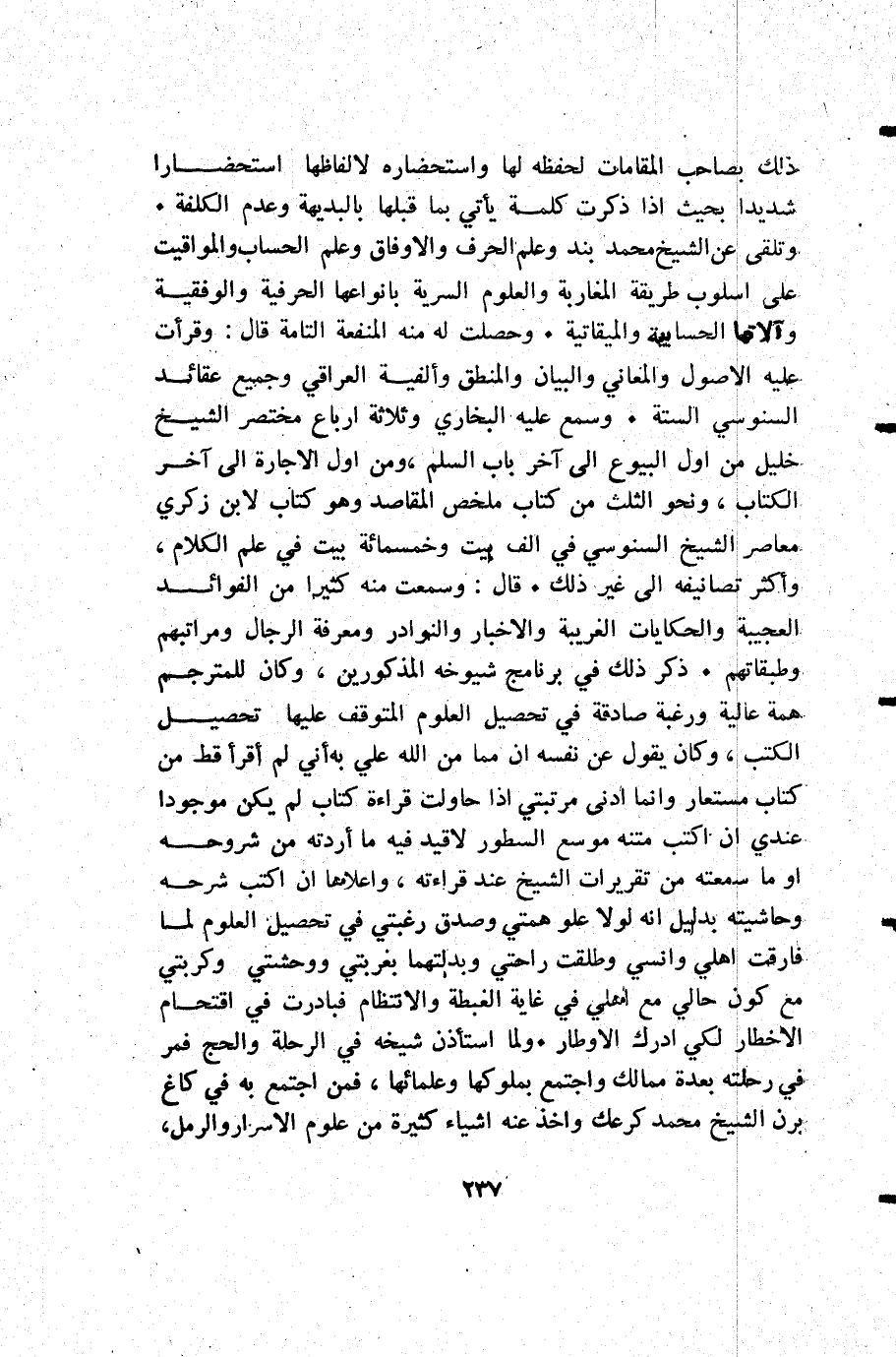 ذلك بصاحب المقامات لحفظه لها واستحضاره لألفاظها استحضارا شديدا بحيث إذا ذكرت كلمة يأتي بما قبلها بالبديهة وعدم الكلفة. وتلقى عن الشيخ محمد بند وعلم الحرف والأوفاق وعلم الحساب والمواقيت على اسلوب طريقة المغاربة والعلوم السرية بانواعها الحرفية والوفقية وآلاتها الحسابية والميقاتية. وحصلت له منه المنفعة التامة قال: وقرأت عليه الأصول والمعاني والبيان والمنطق وألفية العراقي وجميع عقائد السنوسي الستة. وسمع عليه البخاري وثلاثة أرباع مختصر الشيخ خليل من أول البيوع إلى آخر باب السلم ومن أول الإجارة إلى آخر الكتاب ونحو الثلث من كتاب ملخص المقاصد وهو كتاب لابن زكري معاصر الشيخ السنوسي في ألف بيت وخمسمائة بيت في علم الكلام وأكثر تصانيفه إلى غير ذلك. قال: وسمعت منه كثيرا من الفوائد العجيبة والحكايات الغريبة والاخبار والنوادر ومعرفة الرجال ومراتبهم وطبقاتهم. ذكر ذلك في برنامج شيوخه المذكورين وكان للمترجم همة عالية ورغبة صادقة في تحصيل العلوم المتوقف عليه تحصيل الكتب وكان يقول عن نفسه أن مما من الله علي به إني لم أقرأ قط من كتاب مستعار وإنما ادنى مرتبتي إذا حاولت قراءة كتاب لم يكن موجودا عندي أن أكتب متنه موسع السطور لاقيد فيه ما أردته من شروحه أو ما سمعته من تقريرات الشيخ عند قراءته واعلاها أن أكتب شرحه وحاشيته بدليل أنه لولا علو همتي وصدق رغبتي في تحصيل العلوم لما فارقت أهلي وانسي وطلقت راحتي وبدلتهما بغربتي ووحشتي وكربتي مع كون حالي مع أهلي في غاية الغبطة والانتظام فبادرت في اقتحام الاخطار لكي ادرك الأوطار. ولما أستاذن شيخه في الرحلة والحج فمر في رحلته بعدة ممالك واجتمع بملوكها وعلمائها فمن اجتمع به في كاغ برن الشيخ محمد كرعك وأخذ عنه اشياء كثيرة من علوم الأسرار والرمل.