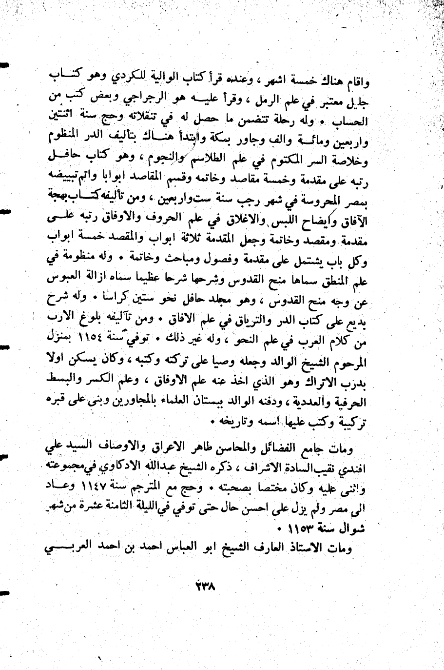 وأقام هناك خمسة أشهر وعنده قرأ كتاب الوالية للكردي وهو كتاب جليل معتبر في علم الرمل وقرأ عليه هو الرجراجي وبعض كتب من الحساب. وله رحلة تتضمن ما حصل له في تنقلاته وحج سنة اثنتين وأربعين ومائة وألف وجاور بمكة وابتدأ هناك بتأليف الدر المنظوم وخلاصة السر المكتوم في علم الطلاسم والنجوم وهو كتاب حافل رتبه على مقدمة وخمسة مقاصد وخاتمه وقسم المقاصد ابوابا واتم تبييضه بمصر المحروسة في شهر رجب سنة ست وأربعين ومن تأليفه كتاب بهجة الآفاق وأيضاح اللبس والاغلاق في علم الحروف والأوفاق رتبه على مقدمة ومقصد وخاتمة وجعل المقدمة ثلاثة ابواب والمقصد خمسة ابواب وكل باب يشتمل على مقدمة وفصول ومباحث وخاتمة. وله منظومة في علم المنطق سماها منح القدوس وشرحها شرحا عظيما سماه ازالة العبوس عن وجه منح القدوس وهو مجلد حافل نحو ستين كراسا. وله شرح بديع على كتاب الدر والترياق في علم الآفاق. ومن تآليفه بلوغ الأرب من كلام العرب في علم النحو وله غير ذلك. توفي سنة 1154 بمنزل المرحوم الشيخ الوالد وجعله وصيا على تركته وكتبه وكان يسكن أولا بدرب الأتراك وهو الذي أخذ عنه علم الأوفاق وعلم الكسر والبسط الحرفية والعددية ودفنه الوالد ببستان العلماء بالمجاورين وبنى على قبره تركيبة وكتب عليها اسمه وتاريخه.