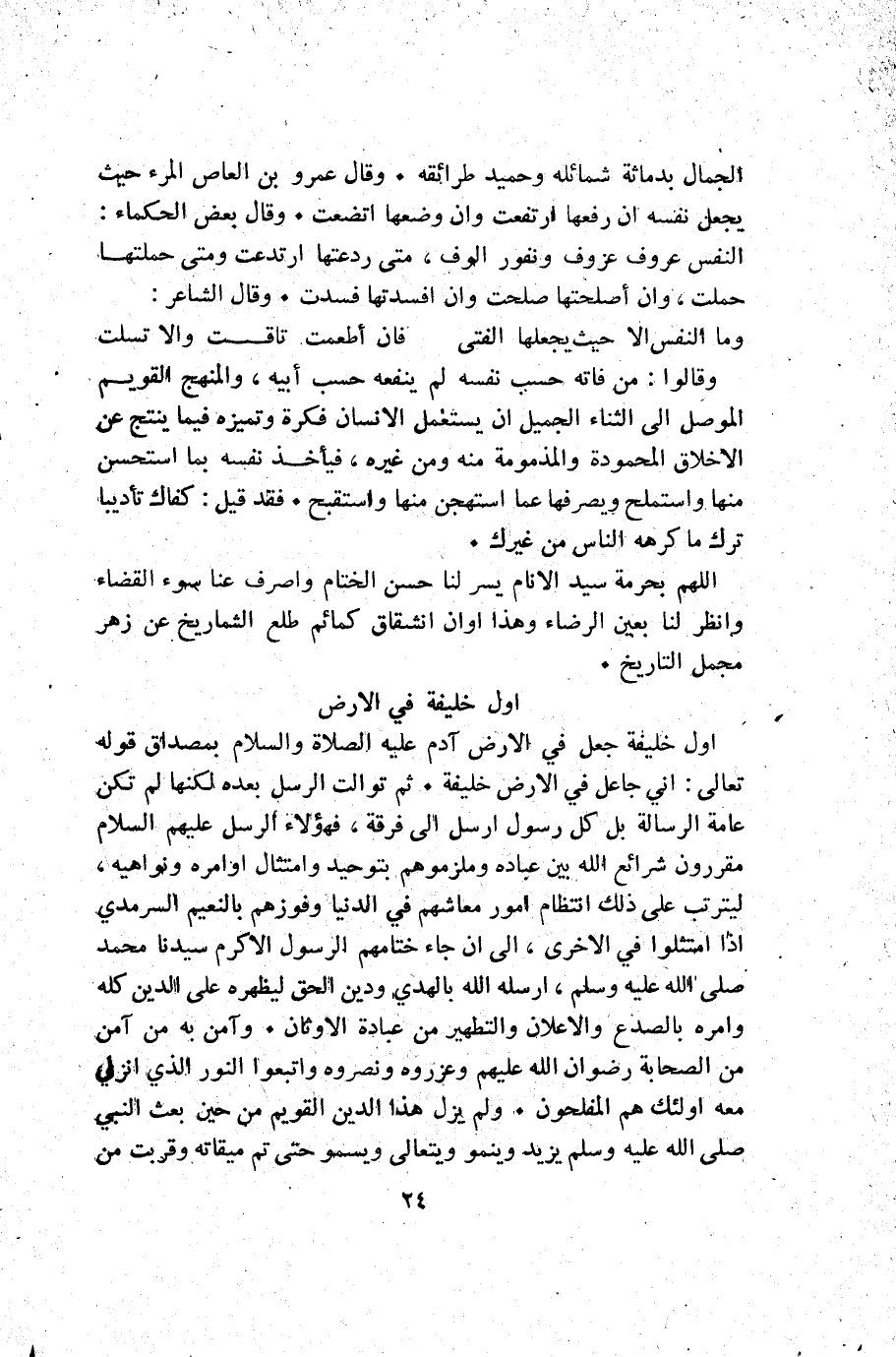اول خليفة جعل في الأرض آدم عليه الصلاة والسلام بمصداق قوله تعالى: {إِنِّي جَاعِلٌ فِي الْأَرْضِ خَلِيفَةً} ثم توالت الرسل بعده لكنها لم تكن عامة الرسالة بل كل رسول أرسل إلى فرقة فهؤلاء الرسل عليهم السلام مقررون شرائع الله بين عباده وملزموهم بتوحيد وامتثال أوامره ونواهيه ليترتب على ذلك انتظام أمور معاشهم في الدنيا وفوزهم بالنعيم السرمدي إذا امتثلوا في الأخرى إلى أن جاء ختامهم الرسول الأكرم سيدنا محمد صلى الله عليه وسلم أرسله الله بالهدي ودين الحق ليظهره على الدين كله وأمره بالصدع والأعلان والتطهير من عبادة الأوثان. وآمن به من أمن من الصحابة رضوان الله عليهم وعزروه ونصروه واتبعوا النور الذي انزي معه أولئك هم المفلحون. ولم يزل هذا الدين القويم من حين بعث النبي صلى الله عليه وسلم يزيد وينمو ويتع إلى ويسمو حتى تم ميقاته وقربت من.
