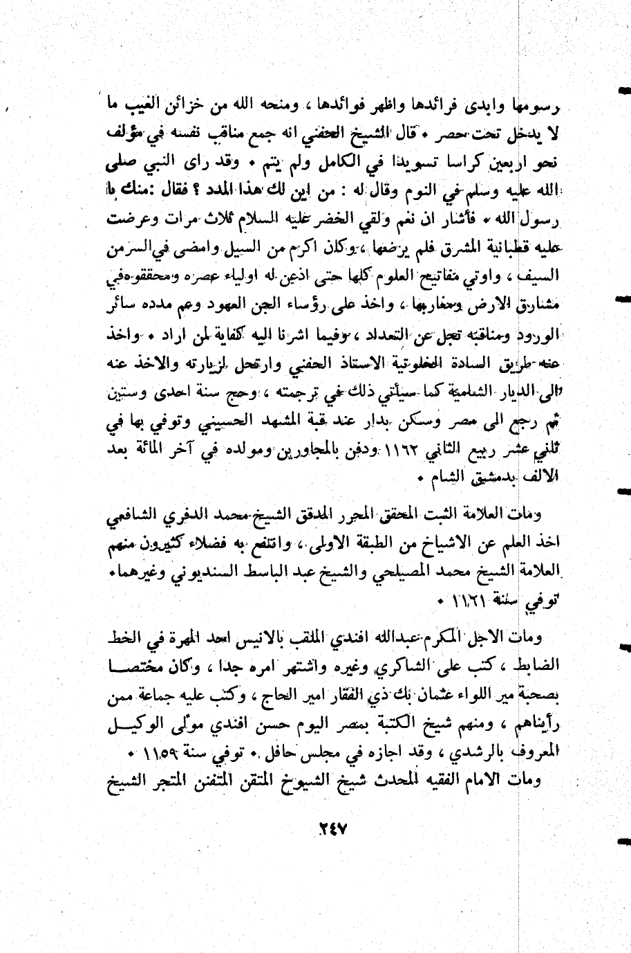 رسومها وأبدى فرائدها واظهر فوائدها ومنحه الله من خزائن الغيب ما لا يدخل تحت حصر. قال الشيخ الحنفى: إنه جمع مناقب نفسه فىمؤلف نحو أربعين كراسا تسويدا في الكامل ولم يتم. وقد رأى النبى صلى الله عليه وسلم في النوم وقال له: "من أين لك هذا المدد" فقال منك يارسول الله. فأشار أن نعم ولقى الخضر عليه السلام ثلاث مرات وعرضت عليه قطبانية المشرق فلم يرضها وكان أكرم من السيل وامضى في السر من السيف وأوتى مفاتيح العلوم كلها حتى اذعن له أولياء عصره ومحققوه في مشارق الأرض ومغاربها وأخذ على رؤساء الجن العهود وعم مدده سائر الورود ومناقبه تجل عن التعداد وفيما اشرنا إليه كفاية لمن أراد. واخذ عنه طريق السادة الخلوتية الأستاذ الحفني وارتحل لزيارته والأخذ عنه إلى الديار الشامية كما سيأتي ذلك في ترجمته وحج سنة أحدى وستين ثم رجع إلى مصر وسكن بدار عند قبة المشهد الحسيني وتوفي بها في ثاني عشر ربيع الثاني 1162 ودفن بالمجاورين ومولده في آخر المائة الالف بدمشق الشام.