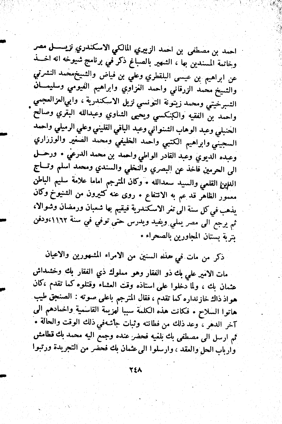 أحمد بن مصطفى بن أحمد الزبيري المالكي الأسكندري نزيل مصر وخاتمة المسندين بها الشهير بالصباغ ذكر في ذكر شيوخه أنه أخذ عن إبراهيم بن عيسى البلقطري وعلي بن فياض والشيخ محمد النشرتي الزرقاني وأحمد الغزاوي وإبراهيم الفيومي وسليمان الشبرخيتي ومحمد زيتونه التونسي نزيل الأسكندرية وابي العز العجمي وأحمد بن الفقيه والكبنكسي ويحيى الشاوي وعبد الله البقري وصالح الحنبلي وعبد الوهاب الشنواني وعبد الباقي القليني وعلي الرميلي وأحمد السجيني وإبراهيم الكتبي وأحمد الخليفي ومحمد الصغير والوزراري وعبده الديوي وعبد القادر الواطي وأحمد بن محمد الدرعي. ورحل إلى الحرمين فأخذ عن البصري والنخلي والسندي ومحمد أسلم وتاج الدين القلعي ووالسيد سعد الله. وكان المترجم إماما علامة سليم الباطن معمور الظاهر قد عم به الانتفاع. روى عنه كثيرون من الشيوخ وكان يذهب في كل سنة إلى تغر الأسكندرية فيقيم بها شعبان ورمضان وشوالا ثم يرجع إلى مصر يملي ويفيد ويدرس حتى توفي في سنة 1162 ودفن بتربة بستان المجاورين بالصحراء.