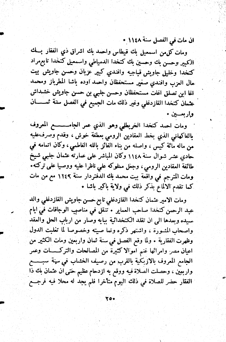 ومات الأمير عثمان كتخدا القازدغلي تابع حسن جاويش القازدغلي والد عبد الرحمن كتخدا صاحب العماير. تنقل في مناصب الوجاقات في أيام سيده وبعدها إلى أن تقلد الكتخدائية ببابه وصار من أرباب الحل والعقد وأصحاب المشورة واشتهر ذكره ونما صيته وخصوصا لما تغلبت الدول وظهرت الفقارية. ولما وقع الفصل في سنة ثمان وأربعين ومات الكثير من اعيان مصر وامرائها غنم أموالا كثيرة من المصالحات والتركات وعمر الجامع المعروف بالازبكية بالقرب من رصيف الخشاب في سنة سبع وأربعين وحصلت الصلاة فيه ووقع به ازدحام عظيم حتى أن عثمان بك ذا الفقار حضر للصلاة في ذلك اليوم متأخرا فلم يجد له محلا فيه فرجع