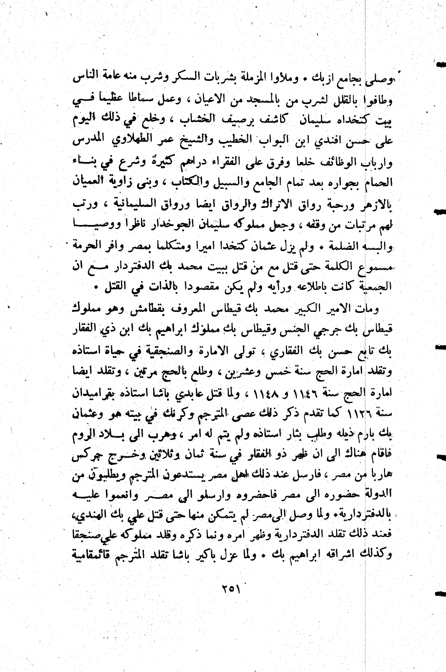 وصلى بجامع ازبك. وملأوا المزملة بشربات السكر وشرب منه عامة الناس وطافوا بالقلل لشرب من بالمسجد من الأعيان وعمل سماطا عظيما في بيت كتخداه سليمان كاشف برصيف الخشاب وخلع في ذلك اليوم على حسن افندى ابن البواب الخطيب والشيخ عمر الطهلاوي المدرس وأرباب الوظائف خلعا وفرق عل الفقراء دراهم كثيرة وشرع في بناء الحمام بجواره بعد تمام الجامع والسبيل والكتاب وبنى زاوية العميان بالأزهر ورحبة رواق الاتراك والرواق أيضا ورواق السليمانيه ورتب لهم مرتبات من وقفه وجعل مملوكه سليمان الجوخدار ناظرا ووصيا والبسه الضلمة. ولم يزل عثمان كتخدا أميرا ومتكلما بمصر وافر الحرمة مسموع الكلمة حتى قتل مع من قتل ببيت محمد بك الدفتردار مع أن الجمعية كانت باطلاعه ورأية ولم يكن مقصودا بالذات في القتل.