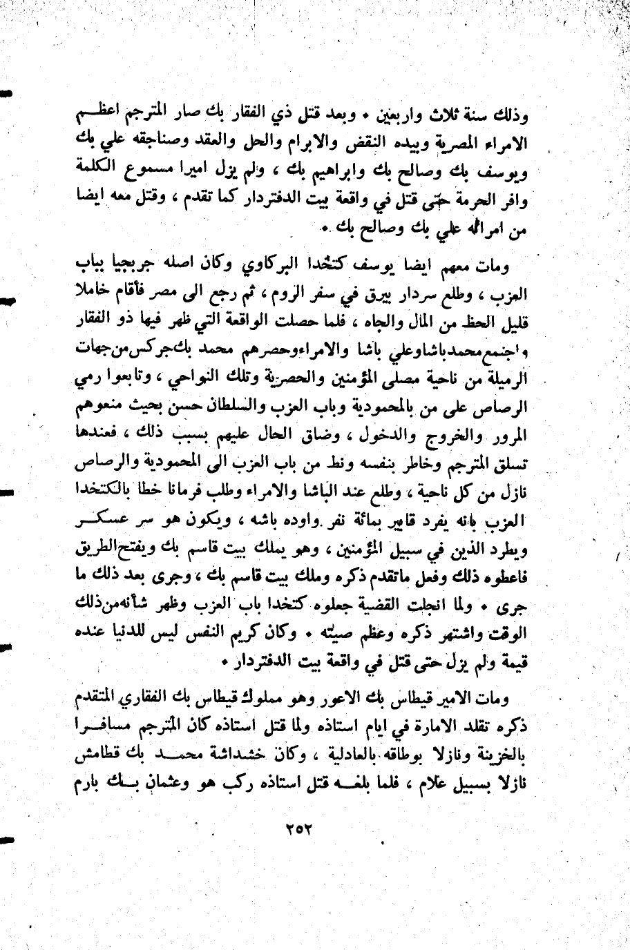 وذلك سنة ثلاث وأربعين. وبعد قتل ذى الفقار بك صار المترجم اعظم الأمراء المصرية وبيده النقض والابرام والحل والعقد وصناجقه علي بك ويوسف بك وصالح بك وإبراهيم بك ولم يزل اميرا مسموع الكلمة وافر الحرمة حتى قتل في واقعة بيت الدفتردار كما تقدم وقتل معه أيضا من أمرائه علي بك وصالح بك.