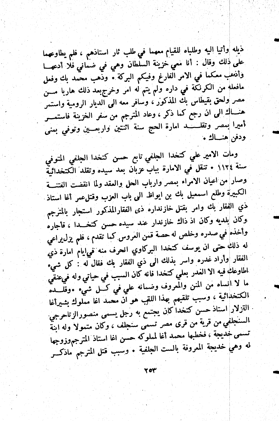ذيله وأتيا إليه وطلباه للقيام معهما في طلب ثأر أستاذهم فلم يطاوعهما على ذلك وقال أنا معي خزينة السلطان وهي في ضماني فلا أدعها وأذهب معكما في الأمر الفارغ وفيكم البركة. وذهب محمد بك وفعل ما فعله من الكرنكة في داره ولم يتم له أمر وخرج بعد ذلك هاربا من مصر ولحق بقيامطس بك المذكور وسافر معه إلى الديار الرومية واستمر هناك إلى أن رجع كما ذكر وعاد المترجم من سفر الخزينة فاستمر أميرا بمصر وتقلد إمارة الحج سنة اثنتين وأربعين وتوفي بمنى ودفن هناك.