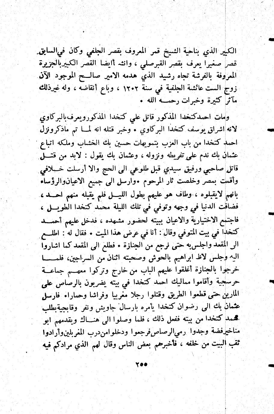 ومات أحمد كتخدا المذكور قاتل علي كتخدا المذكور ويعرف بالبركاوي لأنه اشراق يوسف كتخدا البركاوي. وخبر قتله أنه لما تم ما ذكر ونزل أحمد كتخدا من باب العزب بتمويهات حسين بك الخشاب وملكه اتباع عثمان بك ندم على تفريطه ونزوله وعثمان بك يقول لا بد من قتل قاتل صاحبي ورفيق سيدي قبل طلوعي إلى الحج وإلا أرسلت خلافي وأقمت بمصر وخلصت ثأر المرحوم. وأرسل إلى جميع الأعيان والرؤساء بانهم لا يقبلوه وطاف هو عليهم بطول الليل فلم يقبله منهم أحد فضاقت الدنيا في وجهه وتوفي في تلك الليلة محمد كتخدا الطويل فاجتمع الاختيارية والأعيان ببيته لحضور مشهده فدخل عليهم أحمد كتخدا في بيت المتوفي وقال أنا في عرض هذا الميت. فقال له: اطلع إلى المقعد واجلس به حتى نرجع من الجنازة. فطلع إلى المقعد كما أشاروا إليه وجلس لاظ إبراهيم بالحوش وصحبته اثنان من السراجين فلما خرجوا بالجنازة أغلقوا عليهم الباب من خارج وتركوا معهم جماعة حرسجية وأقاموا مماليك أحمد كتخدا في بيته يضربون بالرصاص على المارين حتى قطعوا الطريق وقتلوا رجلا مغربيا وفراشا وحمارا. فأرسل عثمان بك إلى رضوان كتخدا يأمره بارسال جاويش ونفر وقابجية بطلب محمد كتخدا من بيته ففعل ذلك فلما وصلوا إلى هناك ويقدمهم أبو مناخير فضة وجدوا رمي الرصاص فرجعوا ودخلوا من درب المغربلين وأرادوا ثقب البيت من خلفه فأخبرهم بعض الناس وقال لهم: الذي مرادكم فيه