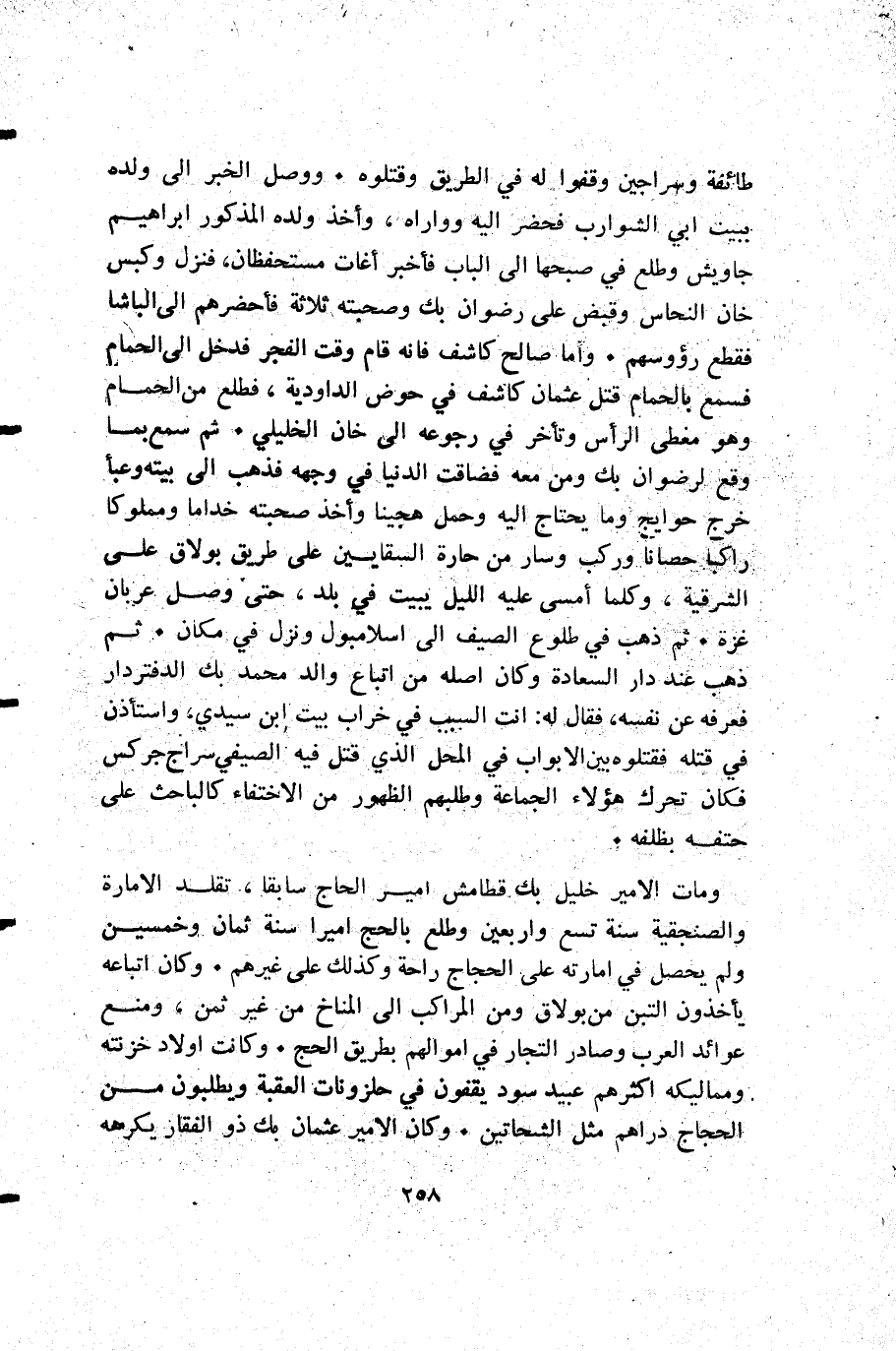 طائفة وسراجين وقفوا له في الطريق وقتلوه. ووصل الخبر إلى ولده ببيت أبي الشوارب فحضر إليه وواراه وأخذ ولده المذكور إبراهيم جاويش وطلع في صبحها إلى الباب فأخبر أغات مستحفظان فنزل وكبس خان النحاس وقبض على رضوان بك وصحبته ثلاثة فأحضرهم إلى الباشا فقطع رؤوسهم. واما صالح كاشف فإنه قام وقت الفجر فدخل إلى الحمام فسمع بالحمام قتل عثمان كاشف في حوض الداودية فطلع من الحمام وهو مغطى الرأس وتأخر في رجوعه إلى خان الخليلي. ثم سمع بما وقع لرضوان بك ومن معه فضاقت الدنيا في وجهه فذهب إلى بيته وعبأ خرج حوايج وما يحتاج إليه وحمل هجينا وأخذ صحبته خداما ومملوكا راكبا حصانا وركب وسار من حارة السقايين على طريق بولاق على الشرقية وكلما أمسى عليه الليل يبيت في بلد حتى وصل عربان غزة. ثم ذهب في طلوع الصيف إلى اسلامبول ونزل في مكان. ثم ذهب عند دار السعادة وكان أصله من اتباع والد محمد بك الدفتردار فعرفه عن نفسه فقال له: أنت السبب في خراب بيت ابن سيدي وأستاذن في قتله فقتلوه بين الأبواب في المحل الذي قتل فيه الصيفي سراج جركس فكان تحرك هؤلاء الجماعة وطلبهم الظهور من الاختفاء كالباحث على حتفه بظلفه.