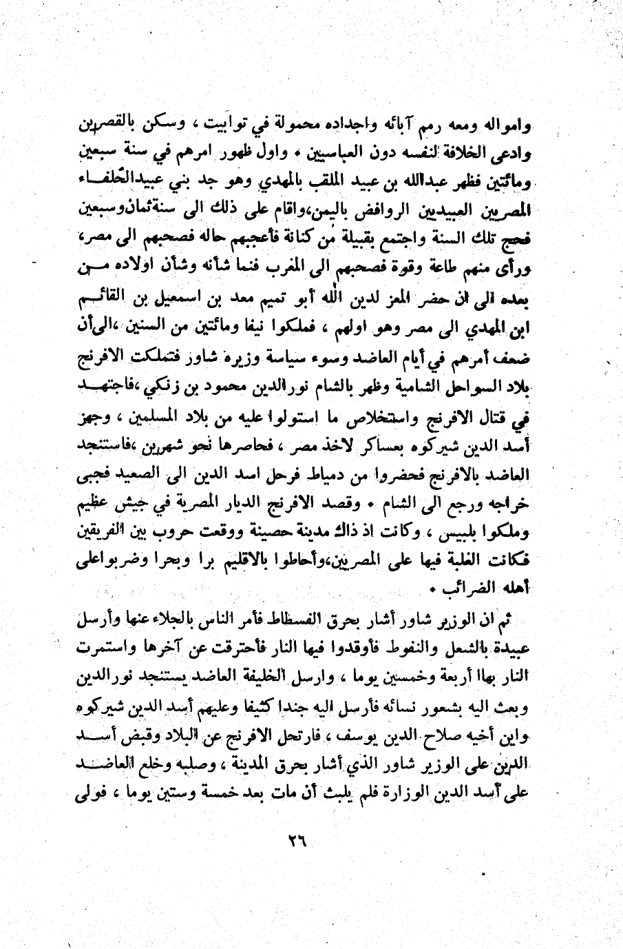 وأمواله ومعه رمم آبائه واجداده محمولة في توابيت وسكن بالقصرين وادعى الخلافة لنفسه دون العباسيين. وأول ظهور أمرهم في سنة سبعين ومائتين فظهر عبد الله بن عبيد الملقب بالمهدي وهو جد بني عبيد الحلفاء المصريين العبيديين الروافض باليمن وأقام على ذلك إلى سنة ثمان وسبعين فحج تلك السنة واجتمع بقبيلة من كنانة فأعجبهم حاله فصحبهم إلى مصر ورأى منهم طاعة وقوة فصحبهم إلى المغرب فنما شأنه وشأن أولاده من بعده إلى أن حضر المعز لدين الله أبو تميم معد بن إسمعيل بن القائم ابن المهدي إلى مصر وهو أولهم فملكوا نيفا ومائتين من السنين إلى أن ضعف أمرهم في أيام العاضد وسوء سياسة وزيره شاور فتملكت الافرنج بلاد السواحل الشامية وظهر بالشام نور الدين محمود بن زنكي فاجتهد في قتال الأفرنج واستخلاص ما استولوا عليه من بلاد المسلمين وجهز أسد الدين شيركوه بعساكر لأخذ مصر فحاصرها نحو شهرين فاستنجد العاضد بالافرنج فحضروا من دمياط فرحل اسد الدين إلى الصعيد فجبى خراجه ورجع إلى الشام. وقصد الافرنج الديار المصرية في جيش عظيم وملكوا بلبيس وكانت إذ ذاك مدينة حصينة ووقعت حروب بين الفريقين فكانت الغلبة فيها على المصريين وأحاطوا بالاقليم برا وبحرا وضربوا على أهله الضرائب.
