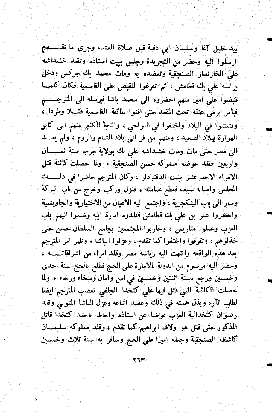 بيد خليل آغا وسليمان أبي دفية قبل صلاة العشاء وجرى ما تقدم أرسلوا إليه وحضر من التجريدة وجلس ببيت أستاذه وتقلد خشداشة على الخازندار الصنجقية وتعضده به ومات محمد بك جركس ودخل براسه علي قطامش ثم تفرغوا للقبض على القاسمية فكان كلما قبضوا على أمير منهم أحضروه إلى محمد باشا فيرسله إلى المترجم فيأمر برمي عنقه تحت المقعد حتى افنوا الطائفة القاسمية قتلا وطردا وتشتتوا في البلاد واختفوا في النواحي والتجأ الكثير منهم إلى أكابر الهوارة ببلاد الصعيد ومنهم من فر إلى بلاد الشام والروم ولم يعد إلى مصر حتى مات ومات خشداشه علي بك بولاية جرجا سنة ثمان وأربعين فقلد عوضه مملوكه حسن الصنجقية. ولما حصلت كائنة قتل الأمراء الأحد عشر ببيت الدفتردار وكان المترجم حاضرا في ذلك المجلس وأصابه سيف فقطع عمامته فنزل وركب وخرج من باب البركة وسار إلى باب الينكجرية واجتمع إليه الأعيان من الاختيارية والجاويشية واحضروا عمر بن علي بك قطامش فقلدوه إمارة أبيه وضموا إليهم باب العزب وعملوا متاريس وحاربوا المجتمعين بجامع السلطان حسن حتى خذلوهم وتفرقوا واختفوا كما تقدم وعزلوا الباشا. وظهر أمر المترجم بعد هذه الواقعة وانتهت إليه رياسة مصر وقلد أمراء من اشراقاته وحضر إليه مرسوم من الدولة بالإمارة على الحج فطلع بالحج سنة أحدى وخمسين ورجع سنة اثنتين وخمسين في أمن وأمان وسخاء ورخاء. ولما حصلت الكائنة التي قتل فيها علي كتخدا الجلفي تعصب المترجم أيضا لطلب ثآره وبذل همته في ذلك وعضد اتباعه وعزل الباشا المتولي وقلد رضوان كتخدائية العزب عوضا عن أستاذه واحاط بأحمد كتخدا قاتل المذكور حتى قتل هو ولاظ إبراهيم كما تقدم وقلد مملوكه سليمان كاشف الصنجقية وجعله اميرا على الحج وسافر به سنة ثلاث وخمسين