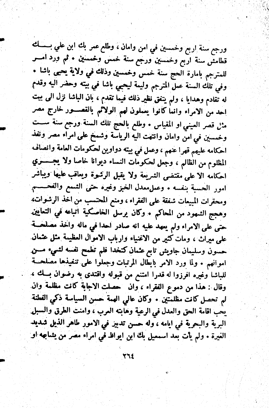 ورجع سنة أربع وخمسين في أمن وأمان وطلع عمر بك ابن علي بك قطامش سنة أربع وخمسين ورجع سنة خمس وخمسين. ثم ورد أمر للمترجم بامارة الحج سنة خمس وخمسين وذلك في ولاية يحيى باشا. وفي تلك السنة عمل المترجم وليمة ليحيى باشا في بيته وحضر إليه وقدم له تقادم وهدايا ولم يتفق نظير ذلك فيما تقدم بان الباشا نزل إلى بيت أحد من الأمراء وإنما كانوا يعملون لهم الولائم بالقصور خارج مصر مثل قصر العيني أو المقياس. وطلع بالحج تلك السنة ورجع سنة ست وخمسين في أمن وأمان وانتهت إليه الرياسة وشمخ على أمراء مصر ونفذ احكامه عليهم قهرا عنهم وعمل في بيته دواوين لحكومات العامة وانصاف المظلوم من الظالم وجعل لحكومات النساء ديوانا خاصا ولا يجري احكامه إلا على مقتضى الشريعة ولا يقبل الرشوة ويعاقب عليها ويباشر أمور الحسبة بنفسه. وعمل معدل الخبز وغيره حتى الشمع والفحم ومحقرات المبيعات شفقة على الفقارء ومنع المحتسب من أخذ الرشوات وهجج الشهود من المحاكم. وكان يرسل الخاصكية اتباعه في التعايين حتى على الأمراء ولم يعهد عليه أنه صادر أحدا في ماله وأخذ مصلحة على ميراث ومات كثير من الأغنياء وأرباب الأموال العظيمة مثل عثمان حسون وسليمان جاويش تابع عثمان كتخدا فلم تطمح نفسه لشيء من أموالهم. ولما ورد الأمر بابطال المرتبات وجعلوا على تنفيذها مصلحة للباشا وغيره افرزوا له قدرا امتنع من قبوله واقتدى به رضوان بك وقال: هذا من دموع الفقراء وإن حصلت الاجابة كانت مظلمة وإن لم تحصل كانت مظلمتين. وكان عالي الهمة حسن السياسة ذكي الفطنة يحب اقامة الحق والعدل في الرعية وهابته العرب وامنت الطرق والسبل البرية والبحرية في أيامه وله حسن تدبير في الأمور طاهر الذيل شديد االغيرة. ولم يأت بعد إسمعيل بك ابن ايواظ في أمراء مصر من يشابهه او