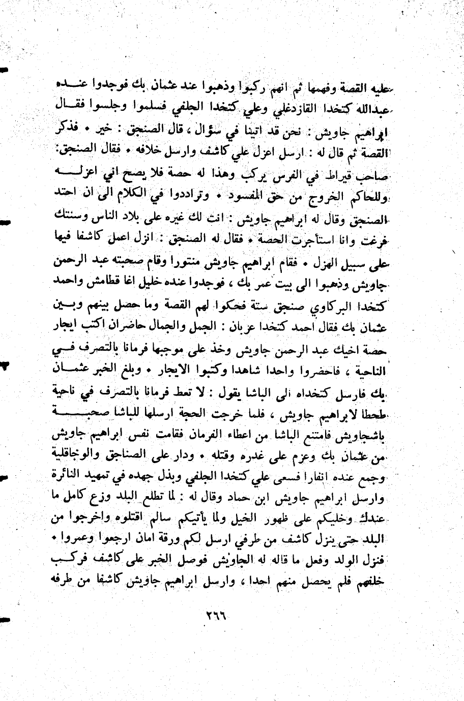 عليه القصة وفمهما ثم إنهم ركبوا وذهبوا عند عثمان بك فوجدوا عنده عبد الله كتخدا القازدغلي وعلي كتخدا الجلفي فسلموا وجلسوا فقال إبراهيم جاويش نحن قد اتينا في سؤال قال الصنجق خير. فذكر القصة ثم قال له: أرسل اعزل علي كاشف وأرسل خلافه. فقال الصنجق صاحب قيراط في الفرس يركب وهذا له حصة فلا يصح إني اعزله وللحاكم الخروج من حق المفسود. وتراددوا في الكلام إلى أن احتد الصنجق وقال إبراهيم جاويش أنت لك غيره على بلاد الناس وسنتك فرغت وأنا استأجرت الحصة. فقال له: الصنجق أنزل اعمل كاشفا فيها على سبيل الهزل. فقام إبراهيم جاويش منتورا وقام صحبته عبد الرحمن جاويش وذهبوا إلى بيت عمر بك فوجدوا عنده خليل اغا قطامش وأحمد كتخدا البركاوي صنجق ستة فحكوا لهم القصة وما حصل بينهم وبين عثمان بك فقال أحمد كتخدا عزبان الجمل والجمال حاضران أكتب ايجار حصة اخيك عبد الرحمن جاويش وخذ على موجبها فرمانا بالتصرف في الناحية فأحضروا واحدا شاهدا وكتبوا الايجار. وبلغ الخبر عثمان بك فأرسل كتخداه إلى الباشا يقول لا تعط فرمانا بالتصرف في ناحية طحطا لإبراهيم جاويش فلما خرجت الحجة أرسلها للباشا صحبة باشجاويش فامتنع الباشا من اعطاء الفرمان فقامت نفس إبراهيم جاويش من عثمان بك وعزم على غدره وقتله. ودار على الصناجق والوجاقلية وجمع عنده انفارا فسعى علي كتخدا الجلفي وبذل جهده في تمهيد النائرة وأرسل إبراهيم جاويش ابن حماد وقال له: لما تطلع البلد وزع كامل ما عندك وخليكم على ظهور الخيل ولما يأتيكم سالم اقتلوه واخرجوا من البلد حتى ينزل كاشف من طرفي أرسل لكم ورقة أمان ارجعوا وعمروا. فنزل الولد وفعل ما قاله له: الجاويش فوصل الخبر على كاشف فركب خلفهم فلم يحصل منهم أحدا وأرسل إبراهيم جاويش كاشفا من طرفه
