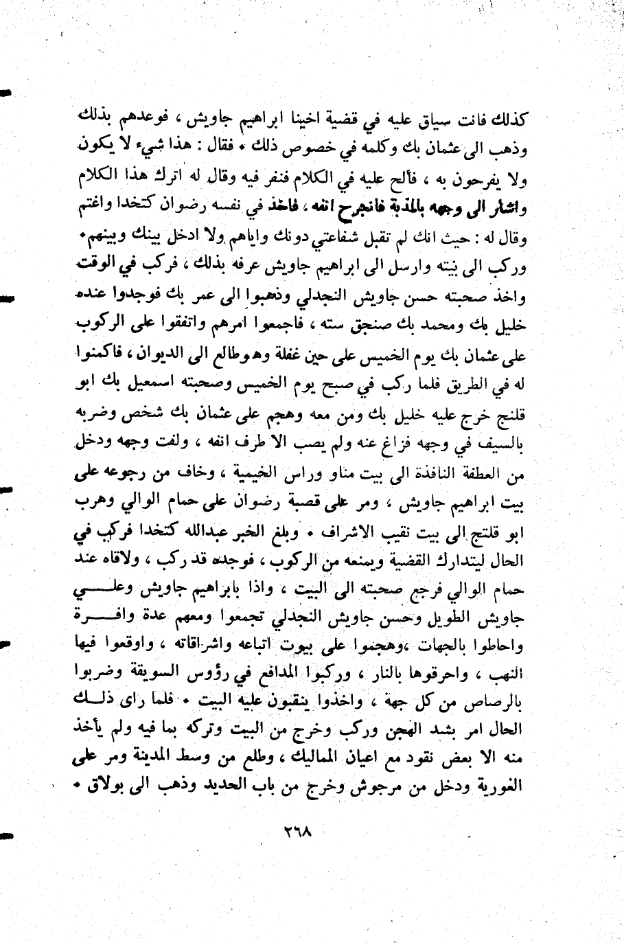 كذلك فانت سياق عليه في قضية اخينا إبراهيم جاويش فوعدهم بذلك وذهب إلى عثمان بك وكلمه في خصوص ذلك. فقال هذا شيء لا يكون ولا يفرحون به فألح عليه في الكلام فنفر فيه وقال له: اترك هذا الكلام وأشار إلى وجهة بالمذبة فانجرح انفه فأخذ في نفسه رضوان كتخدا واغتم وقال له: حيث إنك لم تقبل شفاعتي دونك وأياهم ولا أدخل بينك وبينهم. وركب إلى بيته وأرسل إلى إبراهيم جاويش عرفه بذلك فركب في الوقت وأخذ صحبته حسن جاويش النجدلي وذهبوا إلى عمر بك فوجدوا عنده خليل بك ومحمد بك صنجق ستة فاجمعوا أمرهم واتفقوا على الركوب على عثمان بك يوم الخميس على حين غفلة وهو طالع إلى الديوان فاكمنوا له في الطريق فلما ركب في صبح يوم الخميس وصحبته إسمعيل بك أبو قلنج خرج عليه خليل بك ومن معه وهجم على عثمان بك شخص وضربه بالسيف في وجهه فزاغ عنه ولم يصب إلا طرف انفه ولفت وجهه ودخل من العطفة النافذة إلى بيت مناو وراس الخيمية وخاف من رجوعه على بيت إبراهيم جاويش ومر على قصبة رضوان على حمام الوالي وهرب أبو قلنج إلى بيت نقيب الأشراف. وبلغ الخبر عبد الله كتخدا فركب في الحال ليتدارك القضية ويمنعه من الركوب فوجده قد ركب ولاقاه عند حمام الوالي فرجع صحبته إلى البيت وإذا بإبراهيم جاويش وعلي جاويش الطويل وحسن جاويش النجدلي تجمعوا ومعهم عدة وافرة واحاطوا بالجهات وهجموا على بيوت اتباعه واشراقاته وأوقعوا فيها النهب واحرقوها بالنار وركبوا المدافع في رؤوس السويقة وضربوا بالرصاص من كل جهة وأخذوا ينقبون عليه البيت. فلما رأى ذلك الحال أمر بشد الهجن وركب وخرج من البيت وتركه بما فيه ولم يأخذ منه إلا بعض نقود مع أعيان المماليك وطلع من وسط المدينة ومر على الغورية ودخل من مرجوش وخرج من باب الحديد وذهب إلى بولاق.