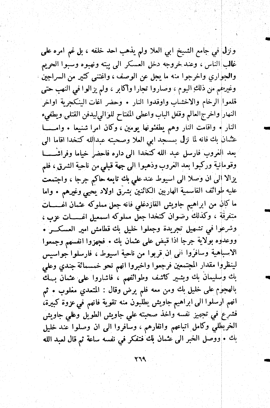 ونزل في جامع الشيخ أبي العلا ولم يذهب أحد خلفه بل غم أمره على غالب الناس وعند خروجه دخل العسكر إلى بيته ونهبوه وسبوا الحريم والجواري واخرجوا منه ما يجل عن الوصف واغتنى كثير من السراجين وغيرهم من ذلك اليوم وصاروا تجارا وأكابر ولم يزالوا في النهب حتى قلعوا الرخام والاخشاب وأوقدوا النار. وحضر اغات الينكجرية أواخر النهار واخرج العالم وقفل الباب واعطى المفتاح للوالي ليدفن القتلى ويطفيء النار وأقامت النار وهم يطفئونها يومين وكان أمرا شنيعا. واما عثمان بك فإنه لما نزل بمسجد أبي العلا وصحبته عبد الله كتخدا أقاما إلى بعد الغروب فأرسل عبد الله كتخدا إلى داره فاحضر خياما وفراشا وقومانية وركبوا بعد الغروب وذهبوا إلى جهة قبلي من ناحية الشرق فلم يزالا إلى أن وصلا إلى اسيوط عند علي بك تابعه حاكم جرجا واجتمعت عليه طوائف القاسمية الهاربين الكائنين بشرق أولاد يحيى وغيرهم. واما ما كان من إبراهيم جاويش القازدغلي فإنه جعل مملوكه عثمان اغات متفرقة وكذلك رضوان كتخدا جعل مملوكه إسمعيل اغات عزب وشرعوا في تشهيل تجريدة وجعلوا خليل بك قطامش أمير العسكر. ووعدوه بولاية جرجا إذا قبض على عثمان بك. فجهزوا انفسهم وجمعوا الأسباهية وسافروا إلى أن قربوا من ناحية اسيوط فأرسلوا جواسيس لينظروا مقدار المجتمعين فرجعوا وأخبروا أنهم نحو خمسمائة جندي وعلي بك وسليمان وبشير كاشف وطوائفهم فاشاروا على عثمان بك بالهجوم على خليل بك ومن معه فلم يرض وقال المتعدي مغلوب. ثم إنهم أرسلوا إلى إبراهيم جاويش يطلبون منه تقوية فإنهم في عزوة كبيرة فشرع في تجهيز نفسه وأخذ صحبته علي جاويش الطويل وعلي جاويش الخربطلي وكامل اتباعهم وانفارهم وسافروا إلى أن وصلوا عند خليل بك. ووصل الخبر إلى عثمان بك فتفكر في نفسه ساعة ثم قال لعبد الله