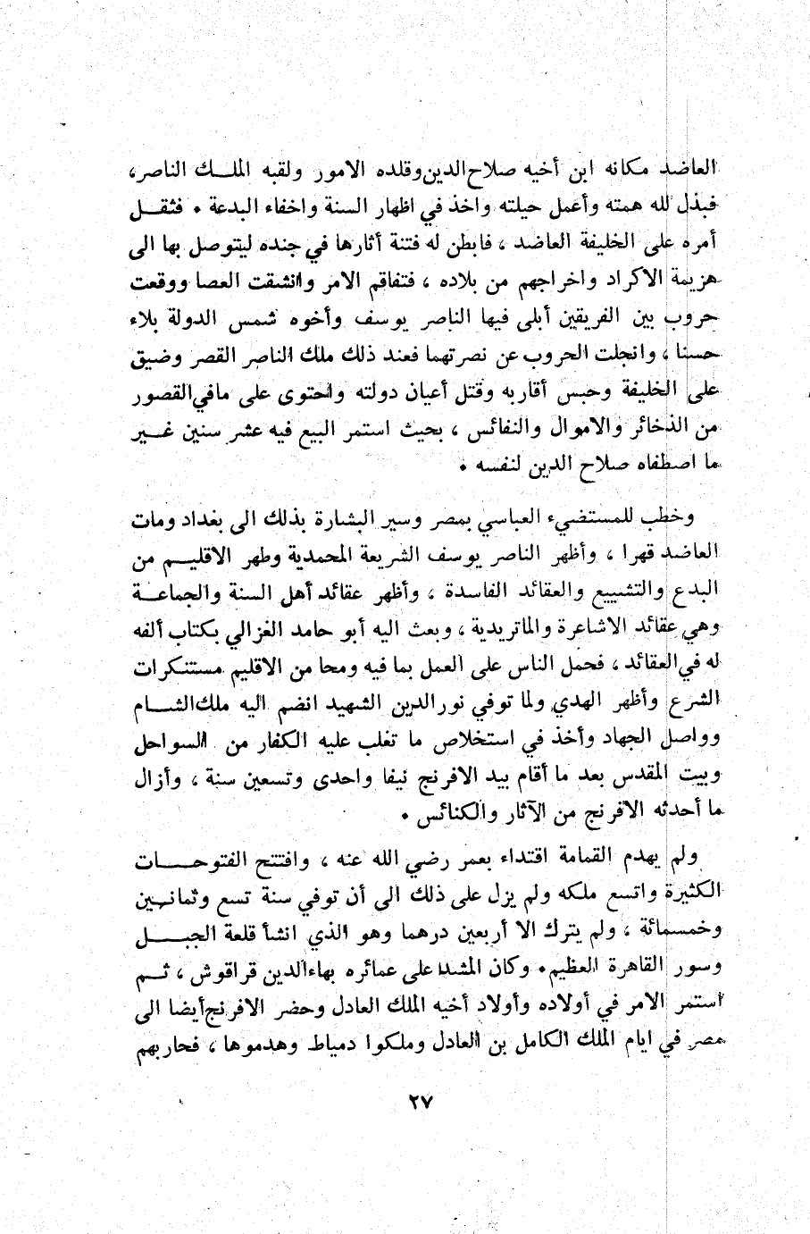 وخطب للمستضيء العباسي بمصر وسير البشارة بذلك إلى بغداد ومات العاضد قهرا وأظهر الناصر يوسف الشريعة المحمدية وطهر الاقليم من البدع والتشييع والعقائد الفاسدة وأظهر عقائد أهل السنة والجماعة وهي عقائد الأشاعرة والماتريدية وبعث إليه أبو حامد الغزالي بكتاب ألفه له في العقائد فحمل الناس على العمل بما فيه ومحا من الاقليم مستنكرات الشرع وأظهر الهدي ولما توفي نور الدين الشهيد انضم إليه ملك الشام وواصل الجهاد وأخذ في استخلاص ما تغلب عليه الكفار من السواحل وبيت المقدس بعد ما أقام بيد الافرنج نيفا وإحدى وتسعين سنة وأزال ما أحدثه الافرنج من الآثار والكنائس.