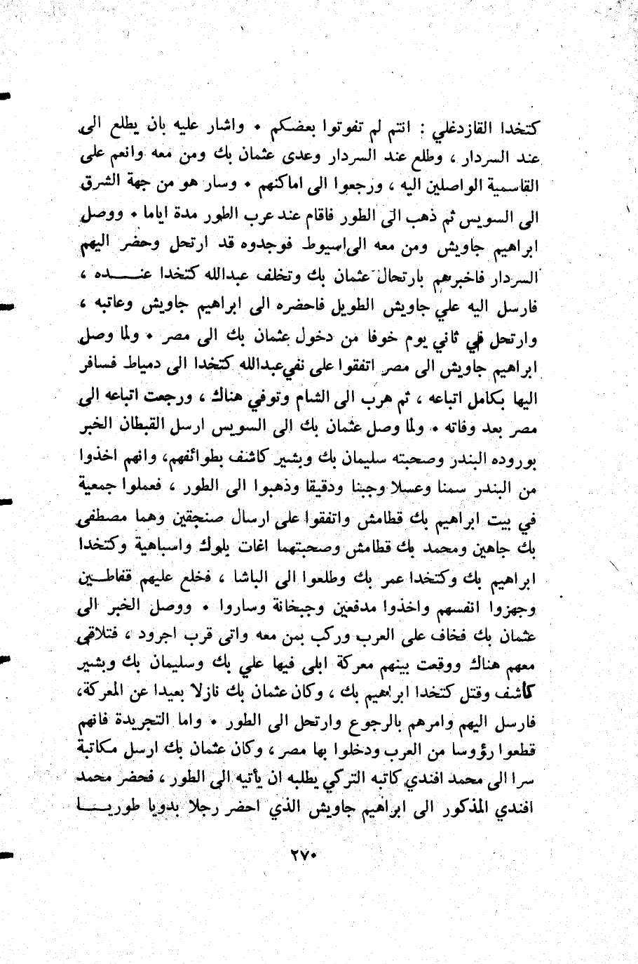 كتخدا القازدغلي أنتم لم تفوتوا بعضكم. واشار عليه بان يطلع إلى عند السردار وطلع عند السردار وعدى عثمان بك ومن معه وانعم على القاسمية الواصلين إليه ورجعوا إلى أماكنهم. وسار هو من جهة الشرق إلى السويس ثم ذهب إلى الطور فاقام عند عرب الطور مدة أياما. ووصل إبراهيم جاويش ومن معه إلى اسيوط فوجدوه قد ارتحل وحضر إليهم السردار فأخبرهم بارتحال عثمان بك وتخلف عبد الله كتخدا عنده فأرسل إليه علي جاويش الطويل فاحضره إلى إبراهيم جاويش وعاتبه وارتحل في ثاني يوم خوفا من دخول عثمان بك إلى مصر. ولما وصل إبراهيم جاويش إلى مصر اتفقوا على نفي عبد الله كتخدا إلى دمياط فسافر إليها بكامل اتباعه ثم هرب إلى الشام وتوفي هناك ورجعت اتباعه إلى مصر بعد وفاته. ولما وصل عثمان بك إلى السويس أرسل القبطان الخبر بوروده البندر وصحبته سليمان بك وبشير كاشف بطوائفهم وإنهم أخذوا من البندر سمنا وعسلا وجبنا ودقيقا وذهبوا إلى الطور فعملوا جمعية في بيت إبراهيم بك قطامش واتفقوا على ارسال صنجقين وهما مصطفى بك جاهين ومحمد بك قطامش وصحبتهما اغات بلوك واسباهية وكتخدا إبراهيم بك وكتخدا عمر بك وطلعوا إلى الباشا فخلع عليهم قفاطين وجهزوا انفسهم وأخذوا مدفعين وجبخانة وساروا. ووصل الخبر إلى عثمان بك فخاف على العرب وركب بمن معه وأتى قرب اجرود فتلاقى معهم هناك ووقعت بينهم معركة ابلى فيها علي بك وسليمان بك وبشير كاشف وقتل كتخدا إبراهيم بك وكان عثمان بك نازلا بعيدا عن المعركة فأرسل إليهم وأمرهم بالرجوع وارتحل إلى الطور. وأما التجريدة فإنهم قطعوا رؤوسا من العرب ودخلوا بها مصر وكان عثمان بك أرسل مكاتبة سرا إلى محمد افندي كاتبه التركي يطلبه أن يأتيه إلى الطور فحضر محمد افندي المذكور إلى إبراهيم جاويش الذي أحضر رجلا بدويا طوريا